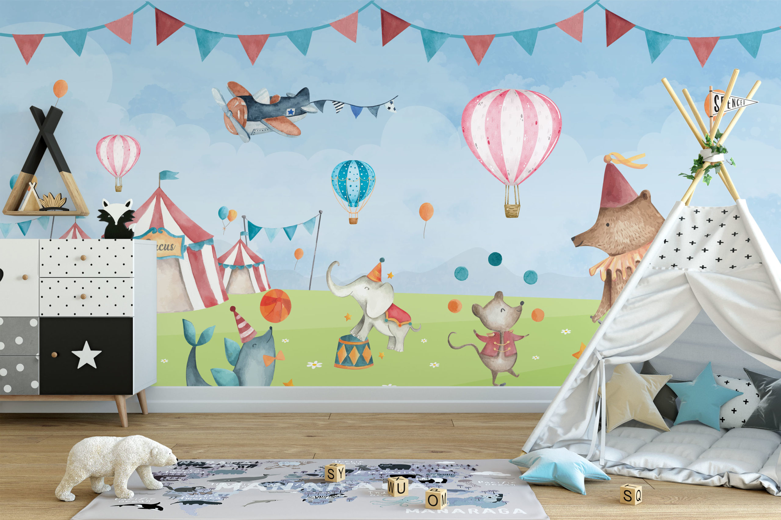 Hooggeëerd publiek, welkom! In onze circustent is het feest, want de circusdieren laten hun beste trucjes zien. We drukken deze toffe schildering op sterk, krasvast en waterproof behang, zodat je zoon of dochter er jarenlang plezier van heeft.[/vc_column_text][porto_block id="4285" name="contact-behang"][vc_empty_space height="20px"][/vc_column][vc_column width="1/2"][porto_block id="1002" name="technische-details-behang"][/vc_column][/vc_row][vc_row][vc_column][vc_separator color="custom" border_width="2" style="solid" accent_color="#f4f4f4"][vc_empty_space height="5px"][/vc_column][/vc_row][vc_row][vc_column width="1/2"][vc_column_text]