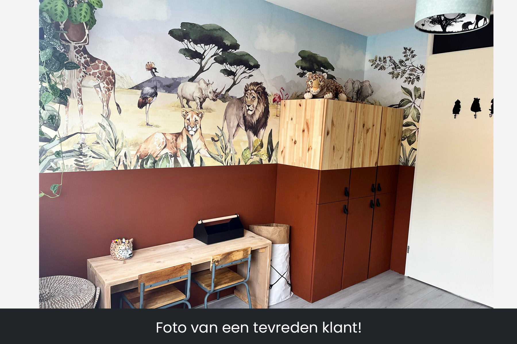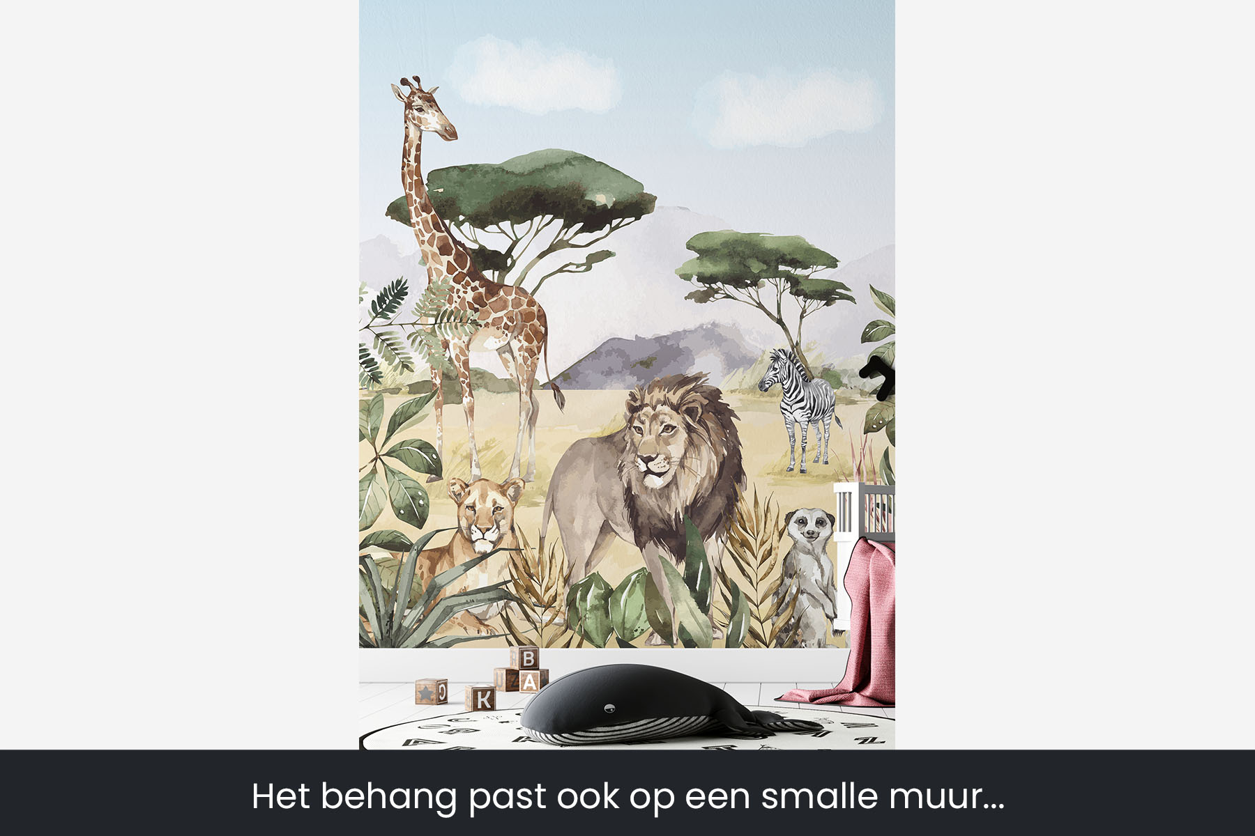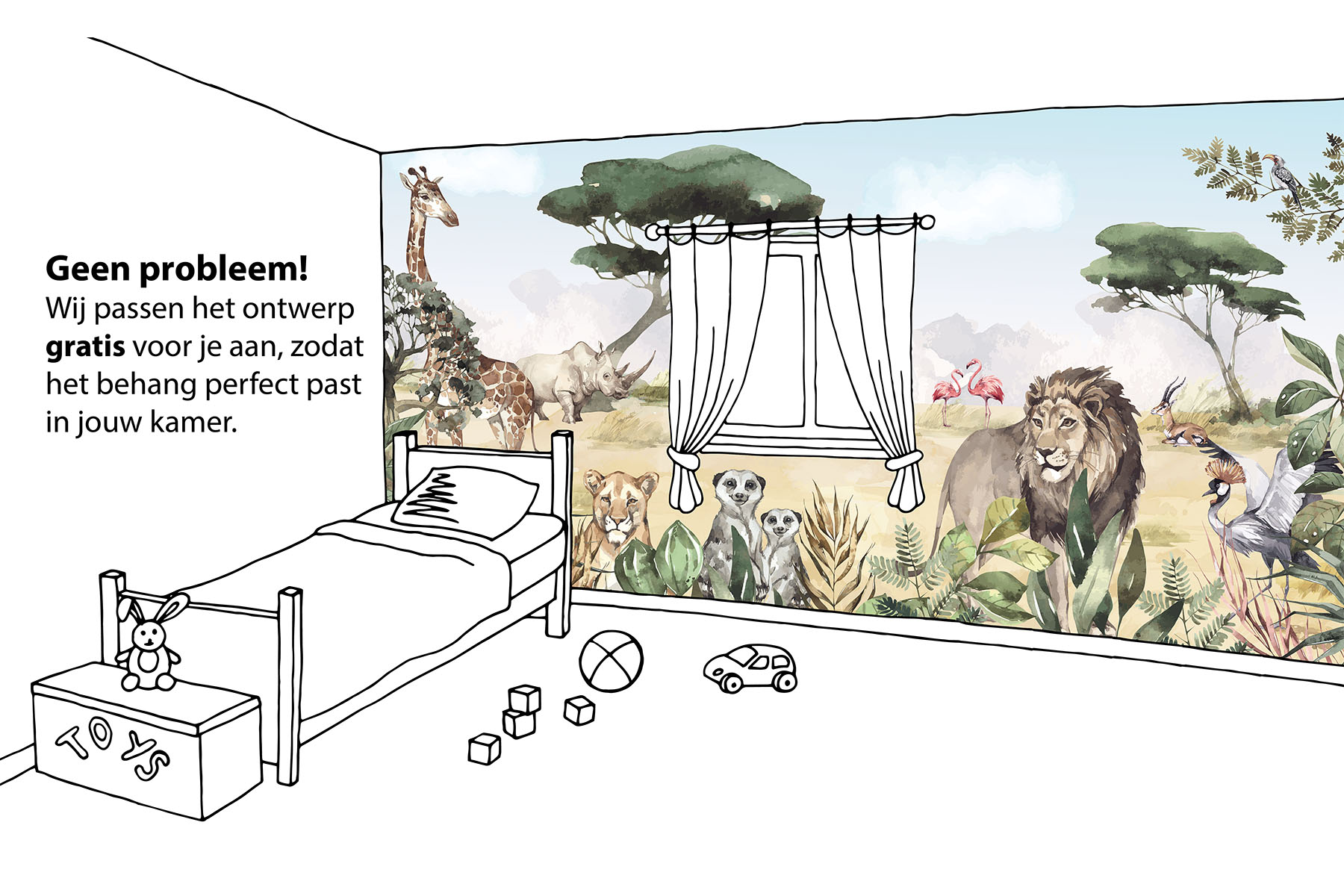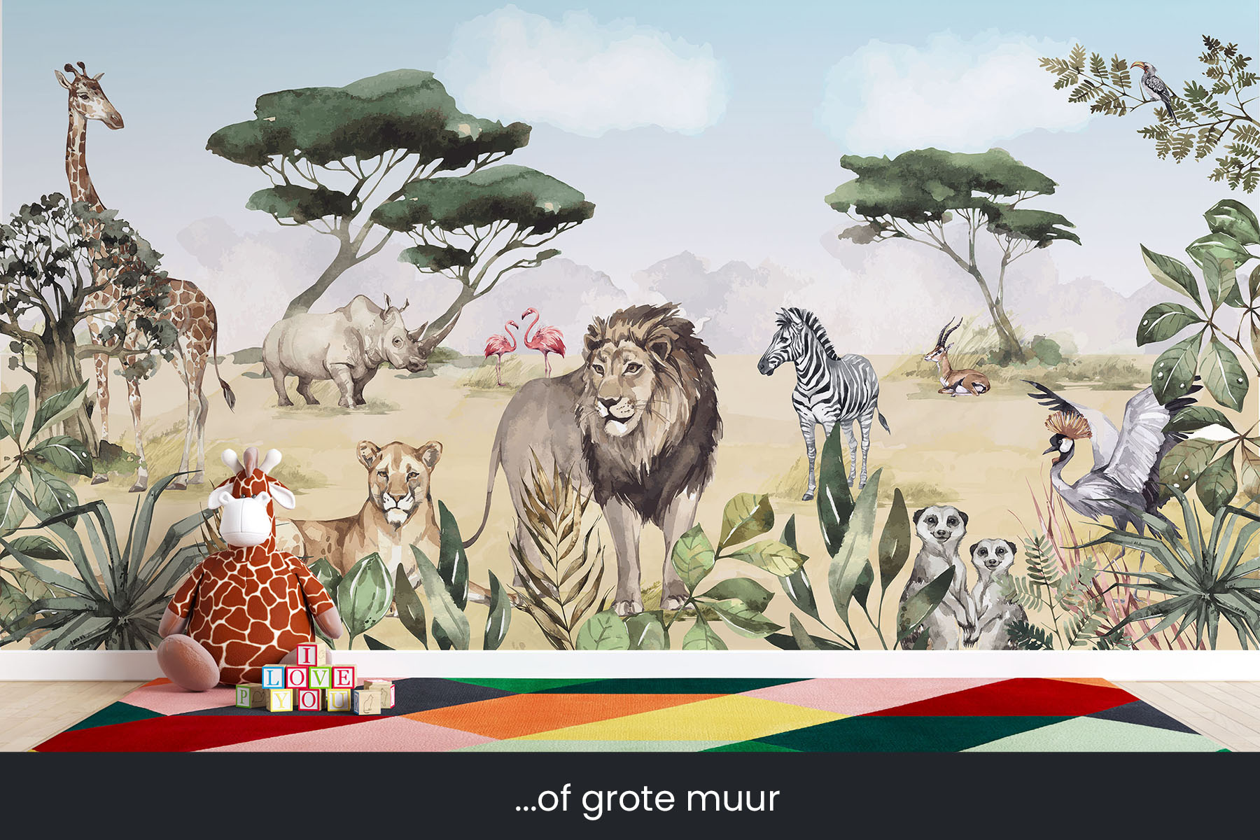 Breng de koning van de dieren naar de slaapkamer van je zoon of dochter. En natuurlijk zijn de giraffe, de zebra, de flamingo, de stokstaartjes en nog veel meer dieren ook van de partij in deze Afrikaanse savanne setting. En mocht je liever nog een olifant op het behang wensen, dan kunnen wij die er gewoon in toevoegen. We drukken deze toffe schildering op sterk, krasvast en waterproof behang, zodat je zoon of dochter er jarenlang plezier van heeft.[/vc_column_text][porto_block id="4285" name="contact-behang"][vc_empty_space height="20px"][/vc_column][vc_column width="1/2"][porto_block id="1002" name="technische-details-behang"][/vc_column][/vc_row][vc_row][vc_column width="1/2"][vc_column_text]