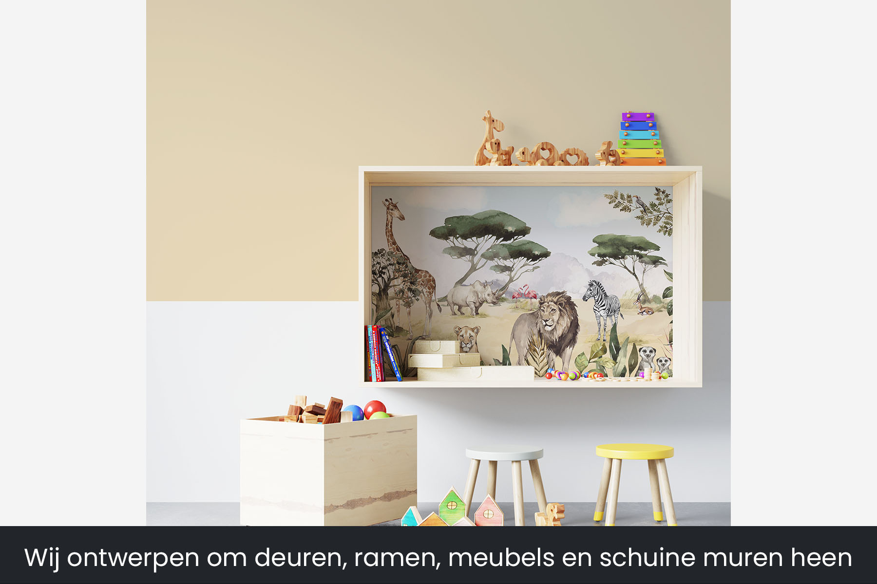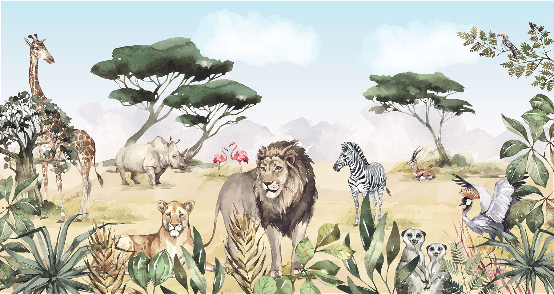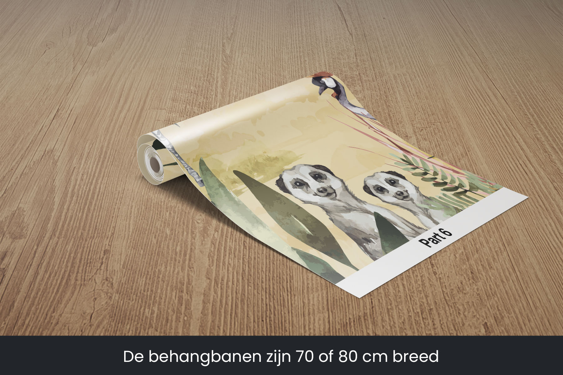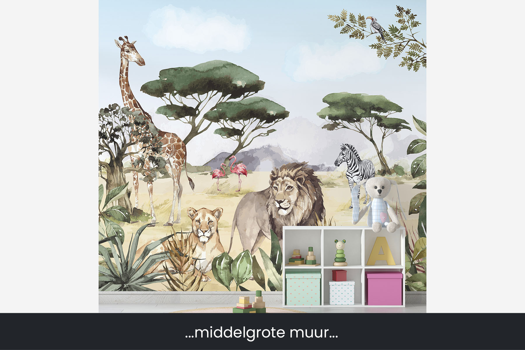 Breng de koning van de dieren naar de slaapkamer van je zoon of dochter. En natuurlijk zijn de giraffe, de zebra, de flamingo, de stokstaartjes en nog veel meer dieren ook van de partij in deze Afrikaanse savanne setting. En mocht je liever nog een olifant op het behang wensen, dan kunnen wij die er gewoon in toevoegen. We drukken deze toffe schildering op sterk, krasvast en waterproof behang, zodat je zoon of dochter er jarenlang plezier van heeft.[/vc_column_text][porto_block id="4285" name="contact-behang"][vc_empty_space height="20px"][/vc_column][vc_column width="1/2"][porto_block id="1002" name="technische-details-behang"][/vc_column][/vc_row][vc_row][vc_column width="1/2"][vc_column_text]