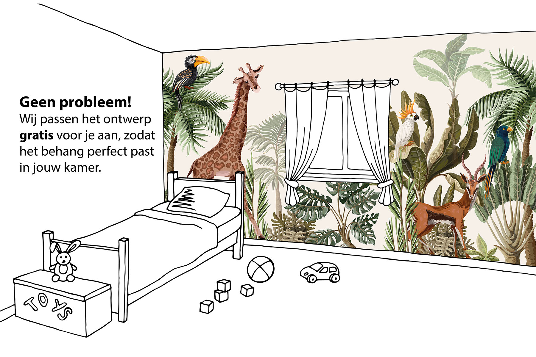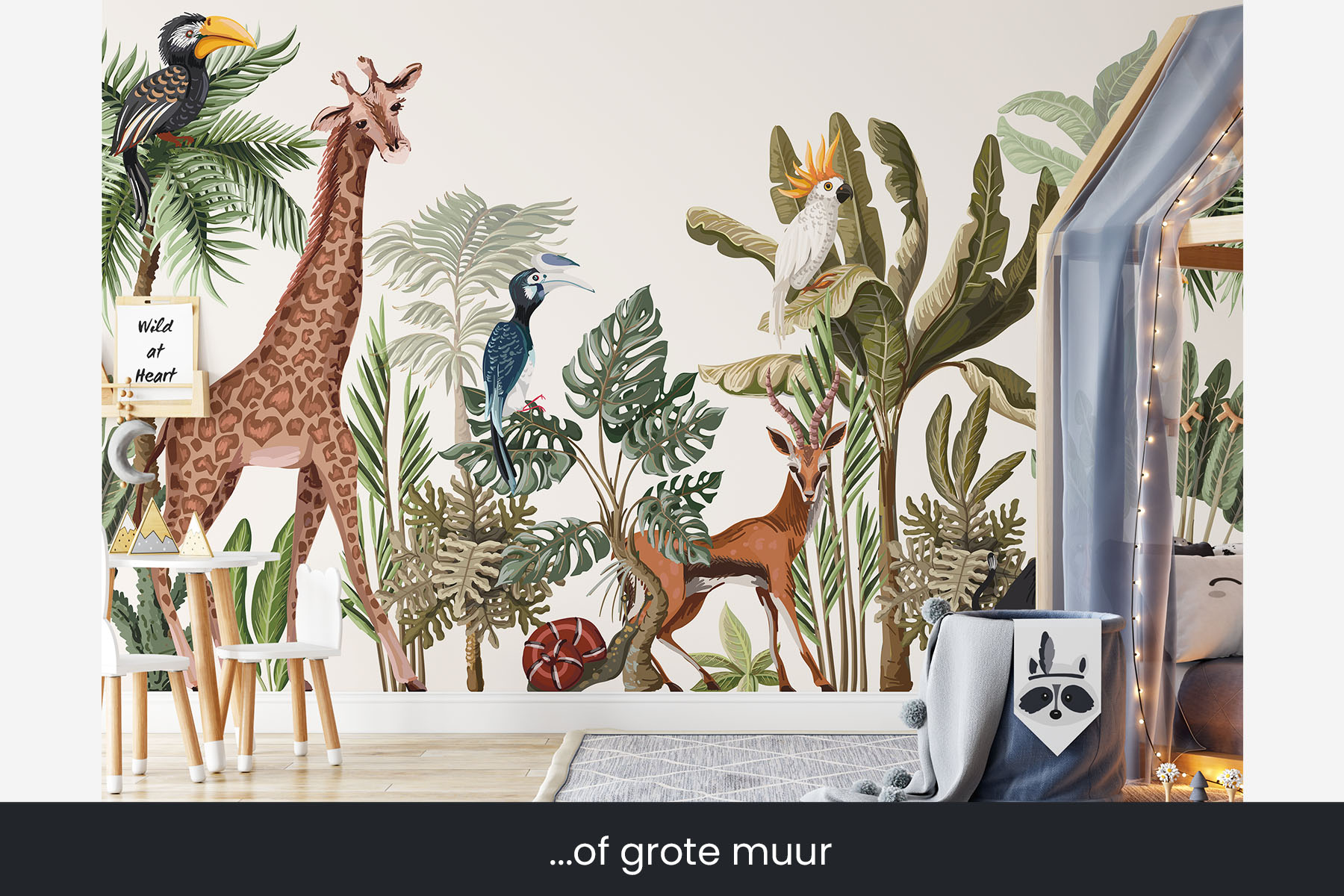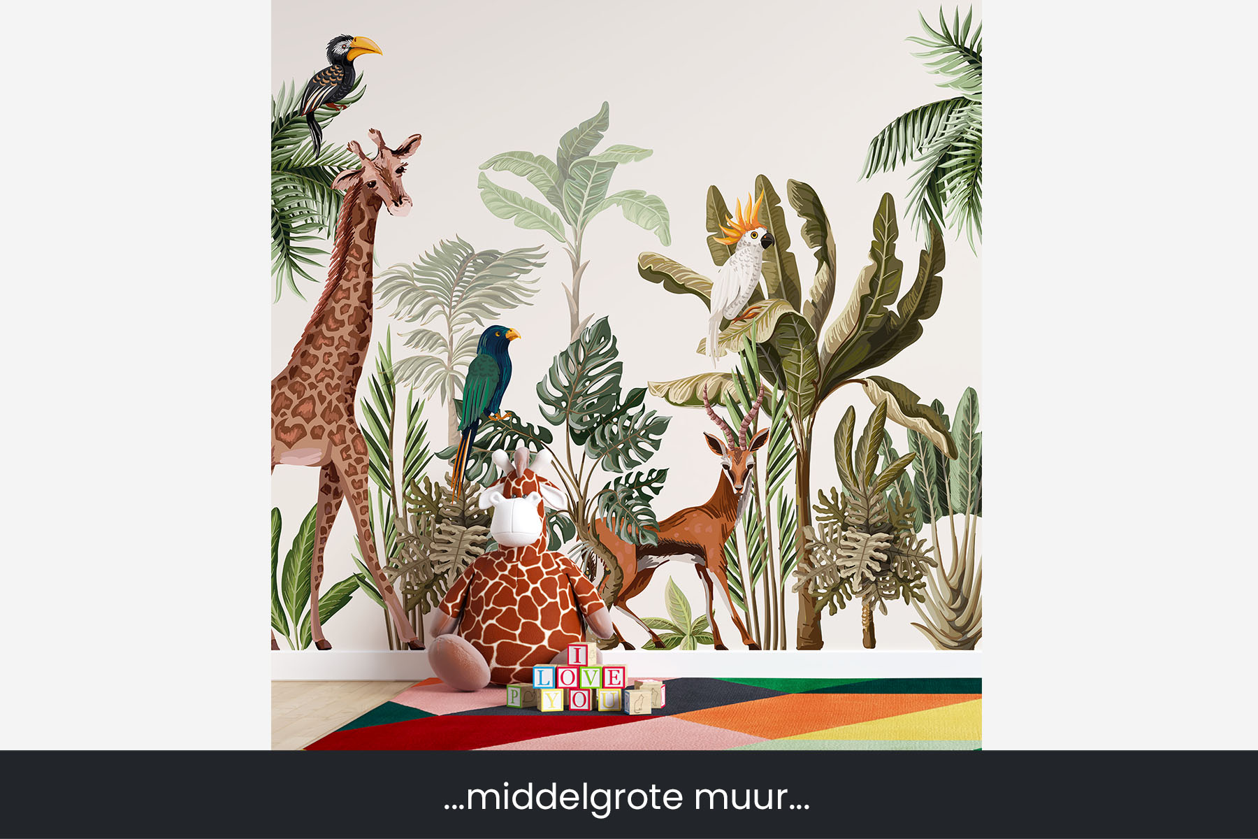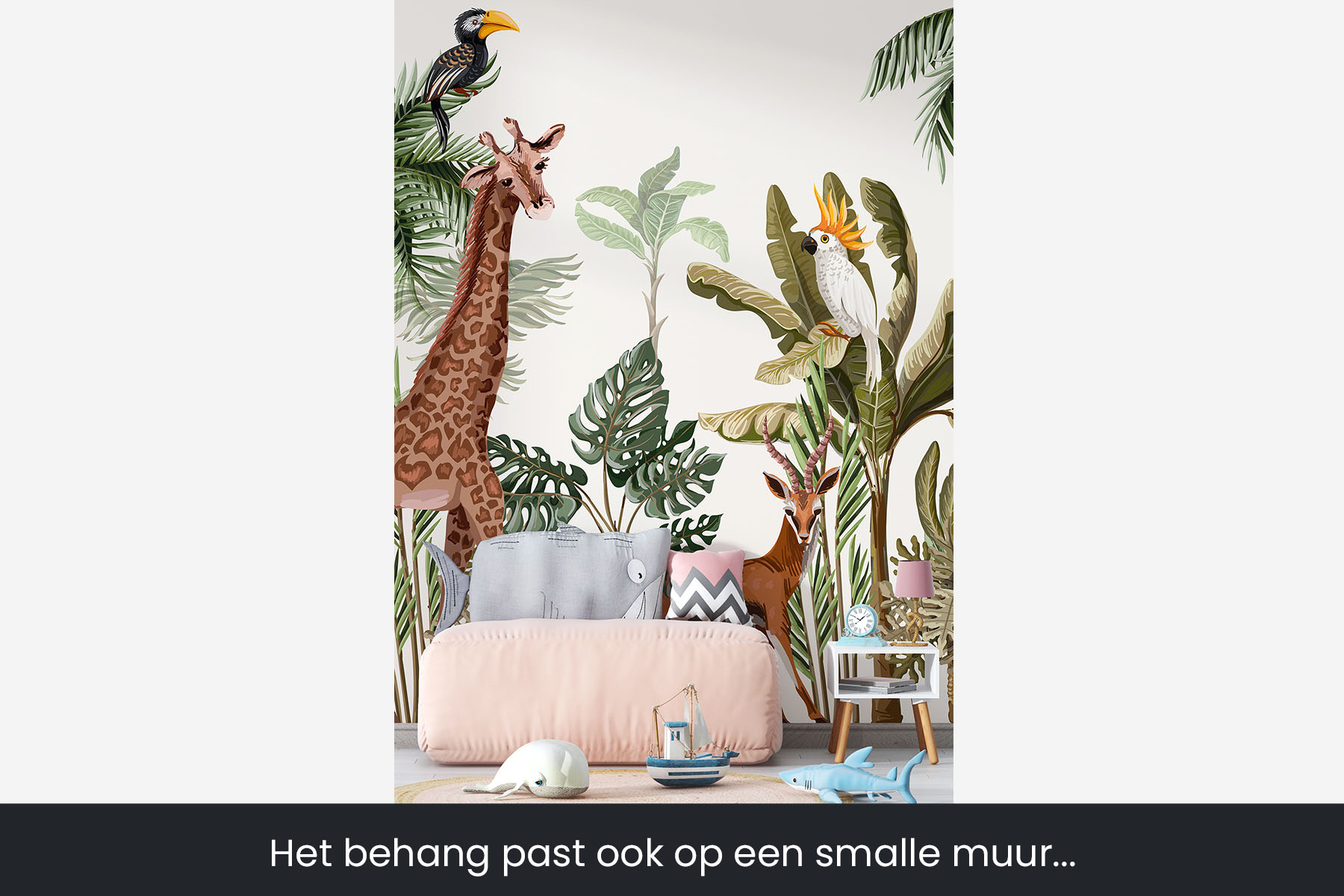Met dit behang ben je de koning van de jungle! Tussen de bladeren, lianen en bloemen zijn er veel dieren te ontdekken, zoals de baviaan, kakatoe en natuurlijk de giraffe die niet te missen is. We drukken deze toffe schildering op sterk, krasvast en waterproof behang, zodat je zoon of dochter er jarenlang plezier van heeft.[/vc_column_text][porto_block id="4285" name="contact-behang"][vc_empty_space height="20px"][/vc_column][vc_column width="1/2"][porto_block id="1002" name="technische-details-behang"][/vc_column][/vc_row][vc_row][vc_column width="1/2"][vc_column_text]