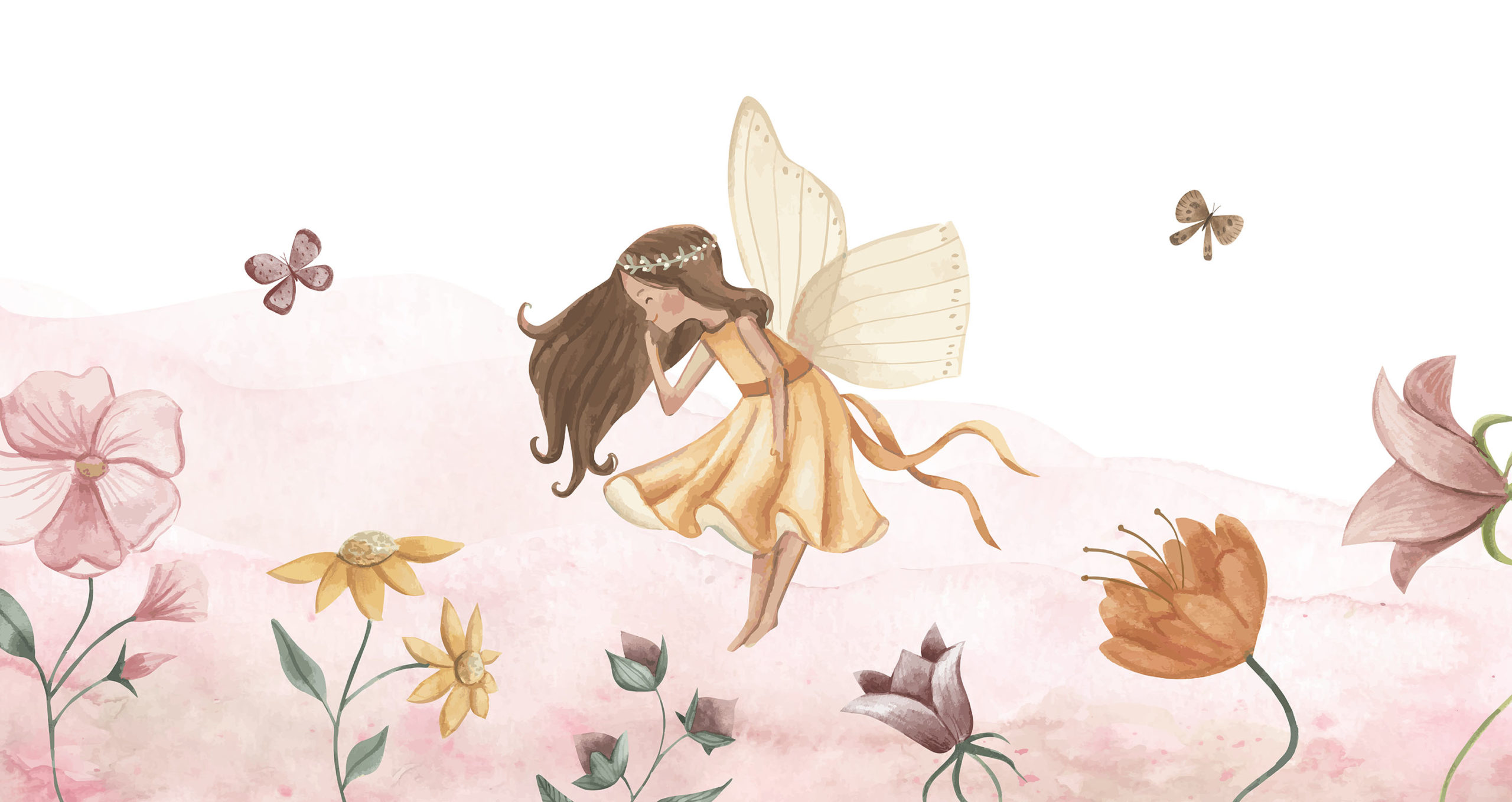 Schattig feeën behang met een feetje dat tussen de bloemen zweeft.