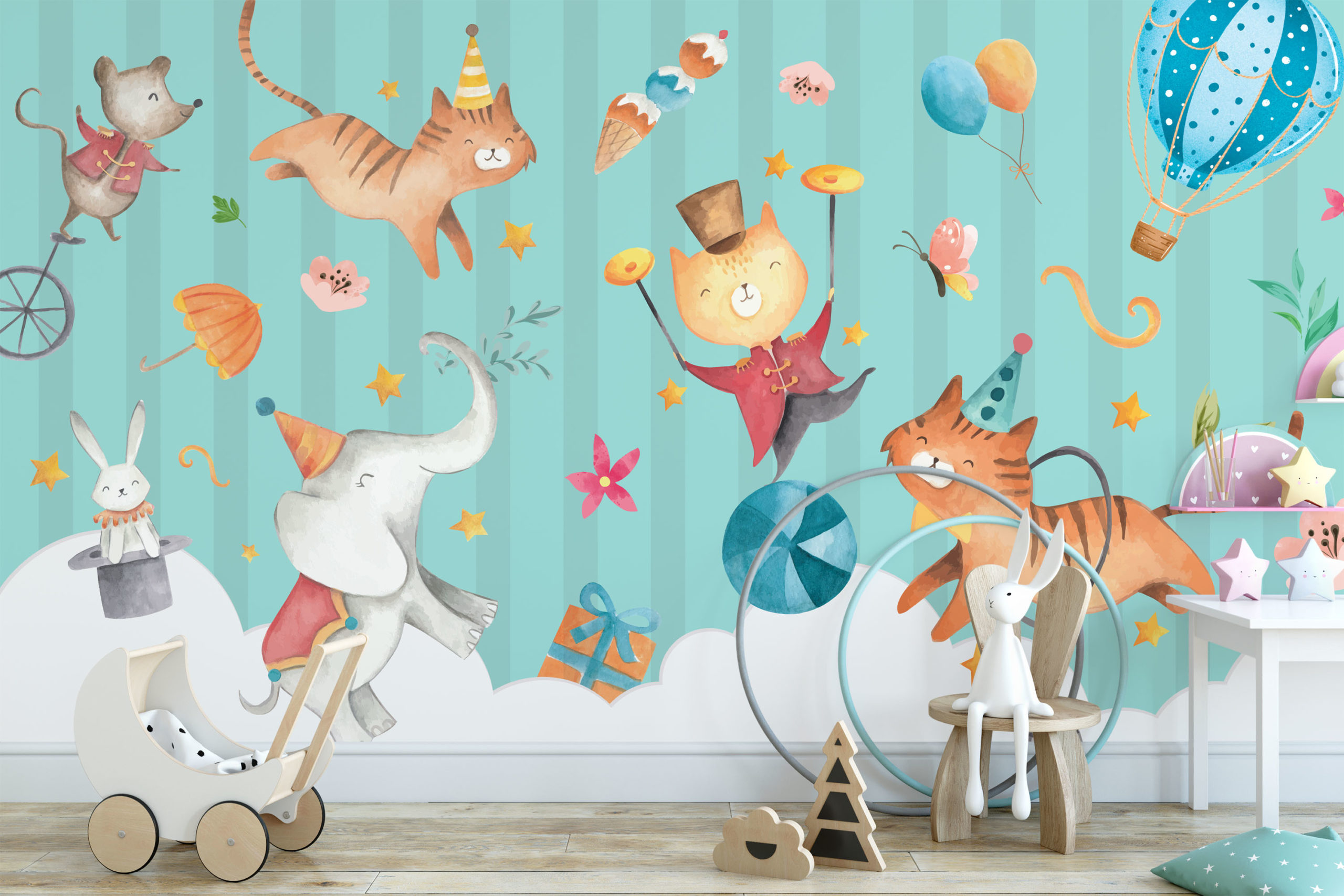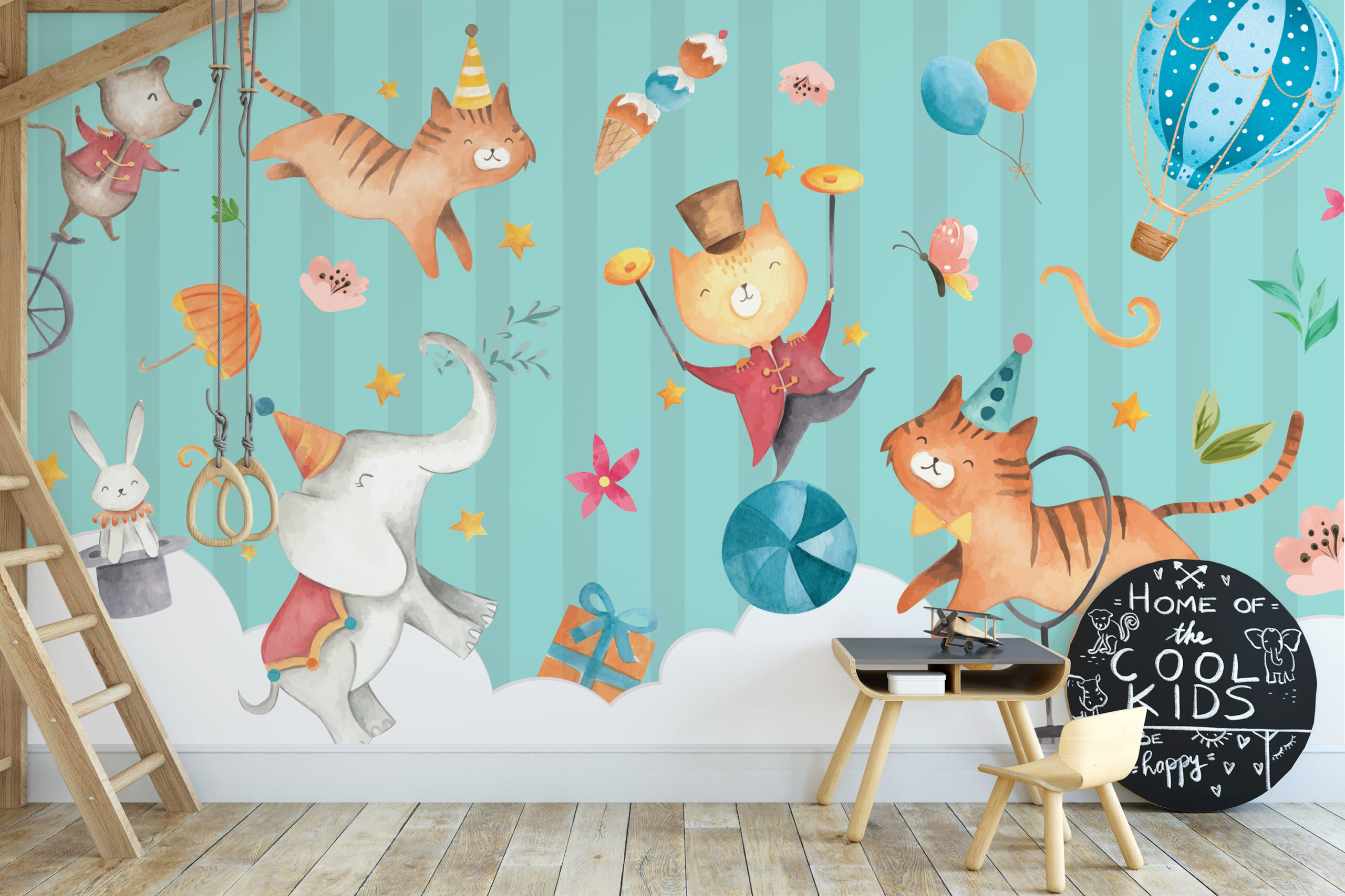 In jouw kinderkamer is het voortaan altijd feest met dit toffe circus behang.