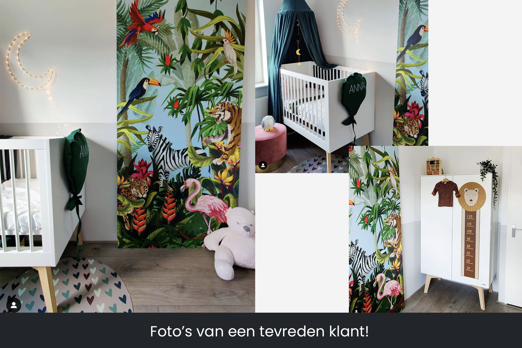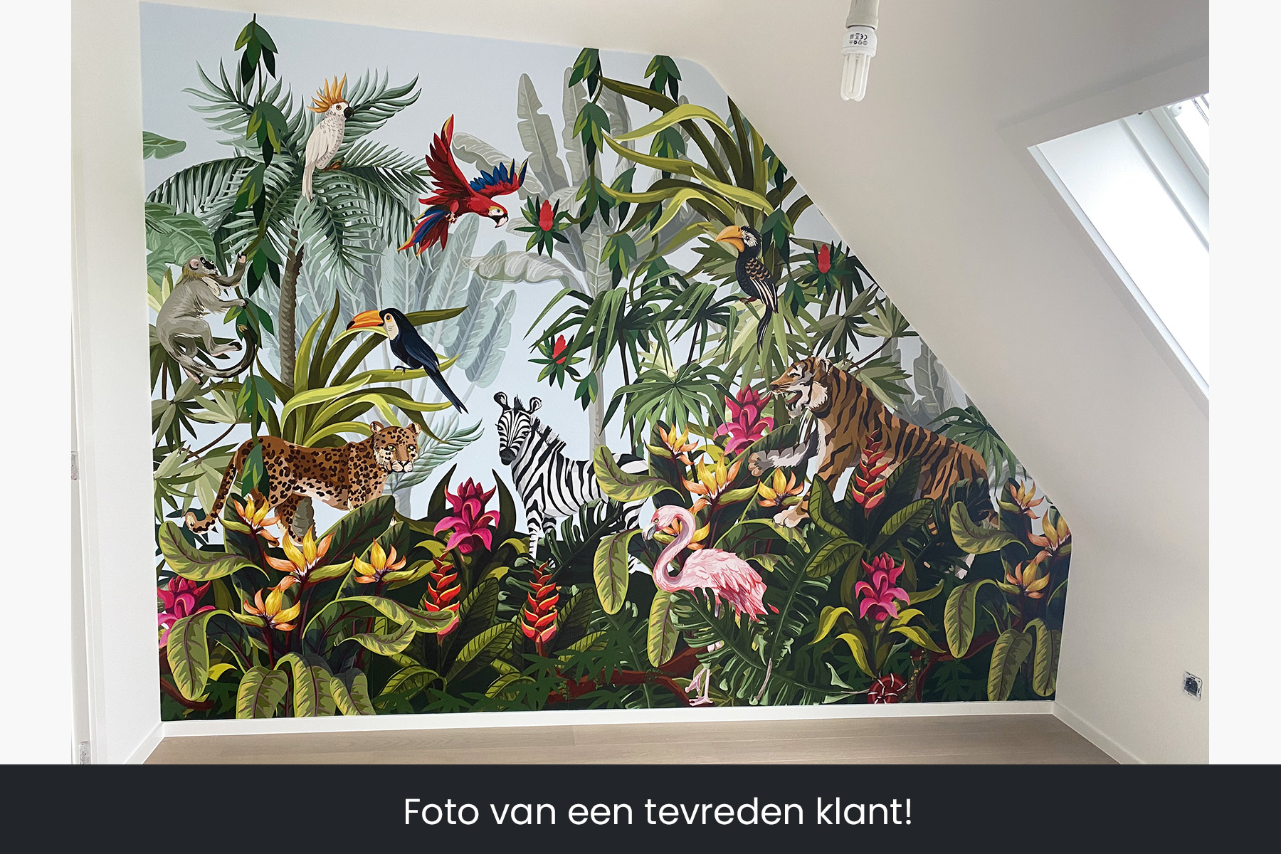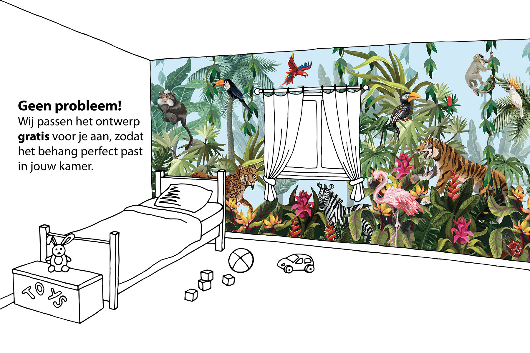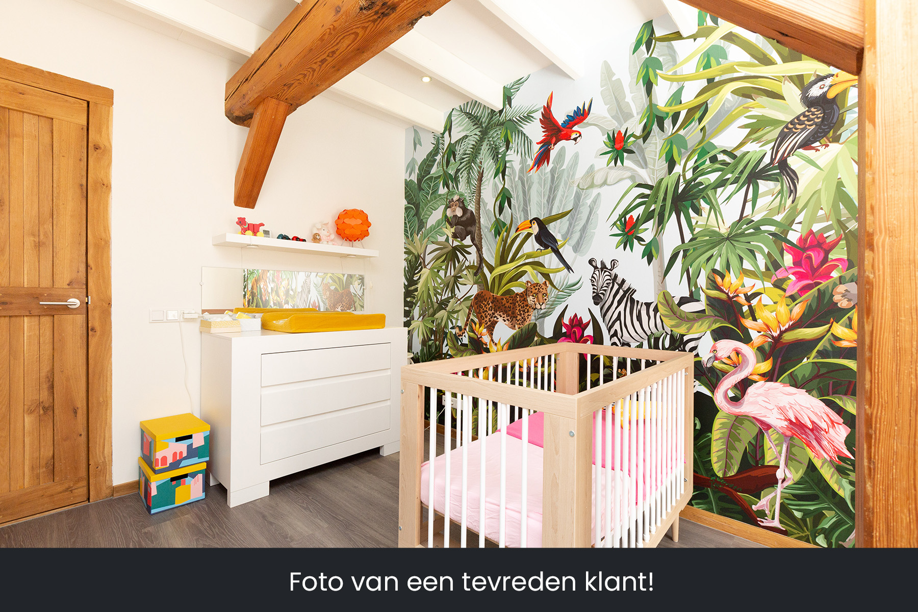 Rawrrr, met dit jungle behang ben je de koning van het oerwoud! Tussen de kleurrijke explosie van bladeren, lianen en bloemen zijn er ontzettend veel dieren te ontdekken; zie jij bijvoorbeeld de tijger, kakatoe en aapjes? We drukken deze toffe schildering op sterk, krasvast en waterproof behang, zodat je zoon of dochter er jarenlang plezier van heeft.[/vc_column_text][porto_block id="4285" name="contact-behang"][vc_empty_space height="20px"][/vc_column][vc_column width="1/2"][porto_block id="1002" name="technische-details-behang"][/vc_column][/vc_row][vc_row][vc_column width="1/2"][vc_column_text]