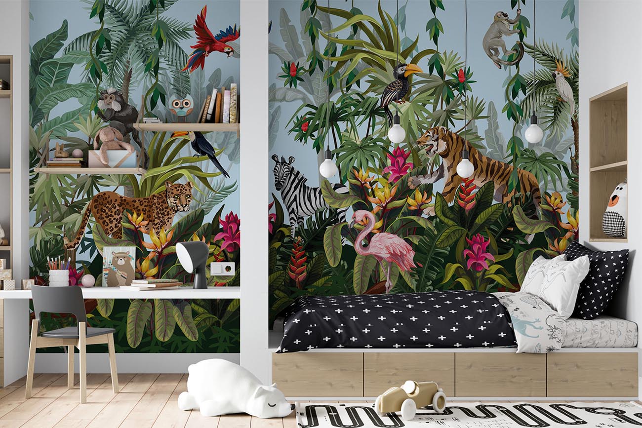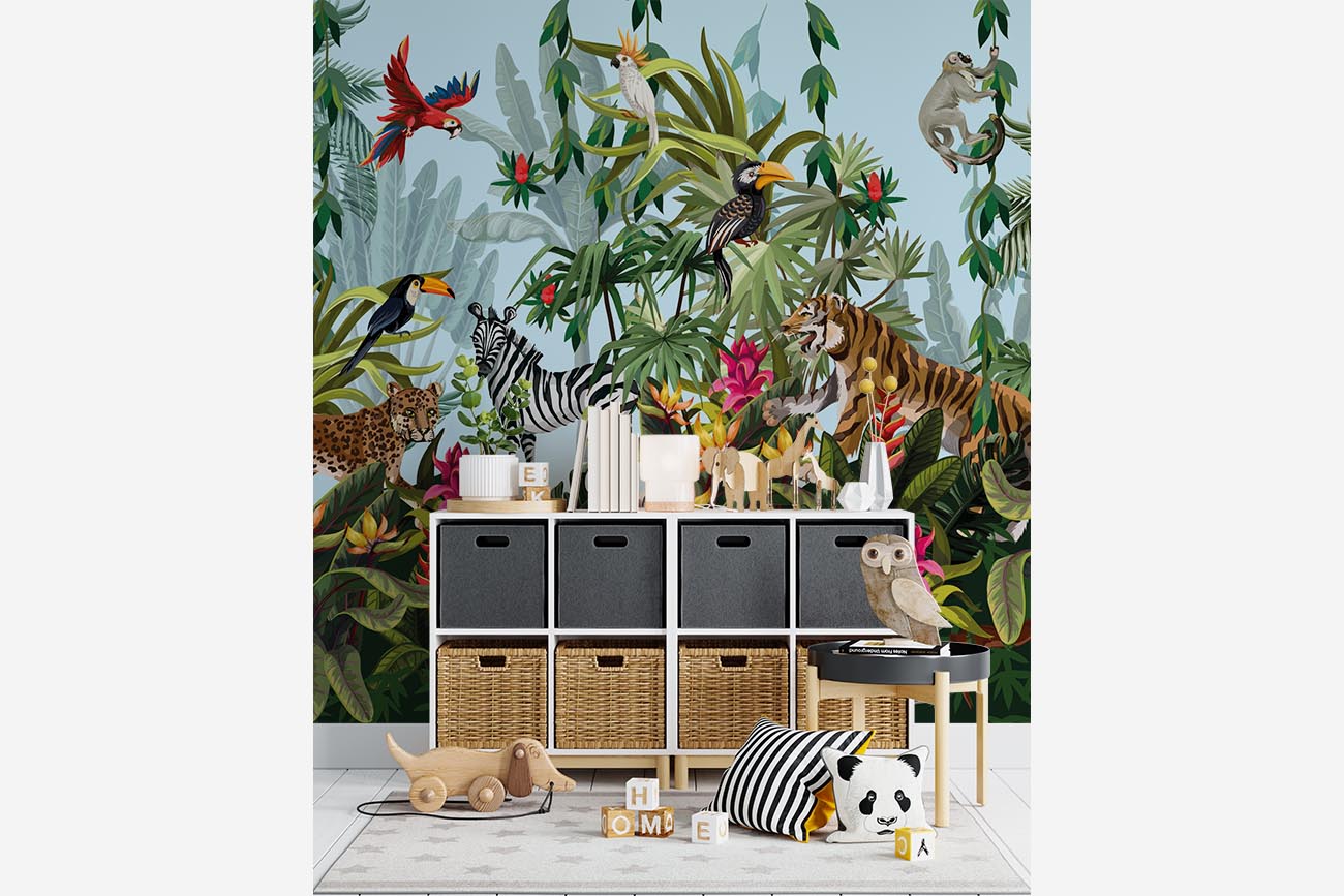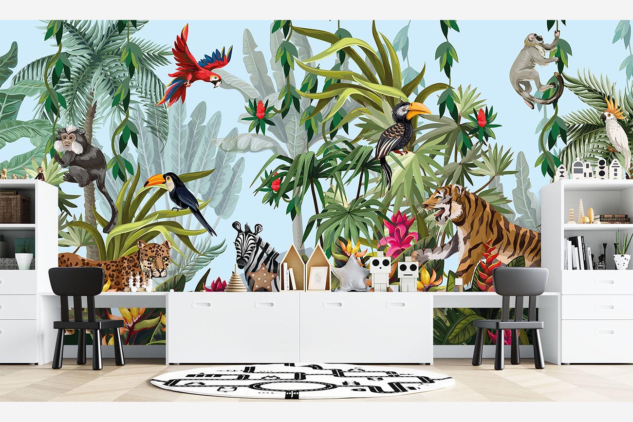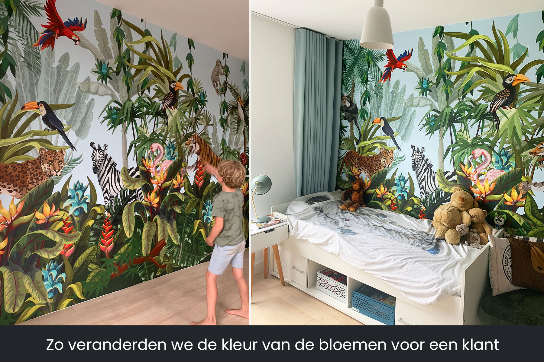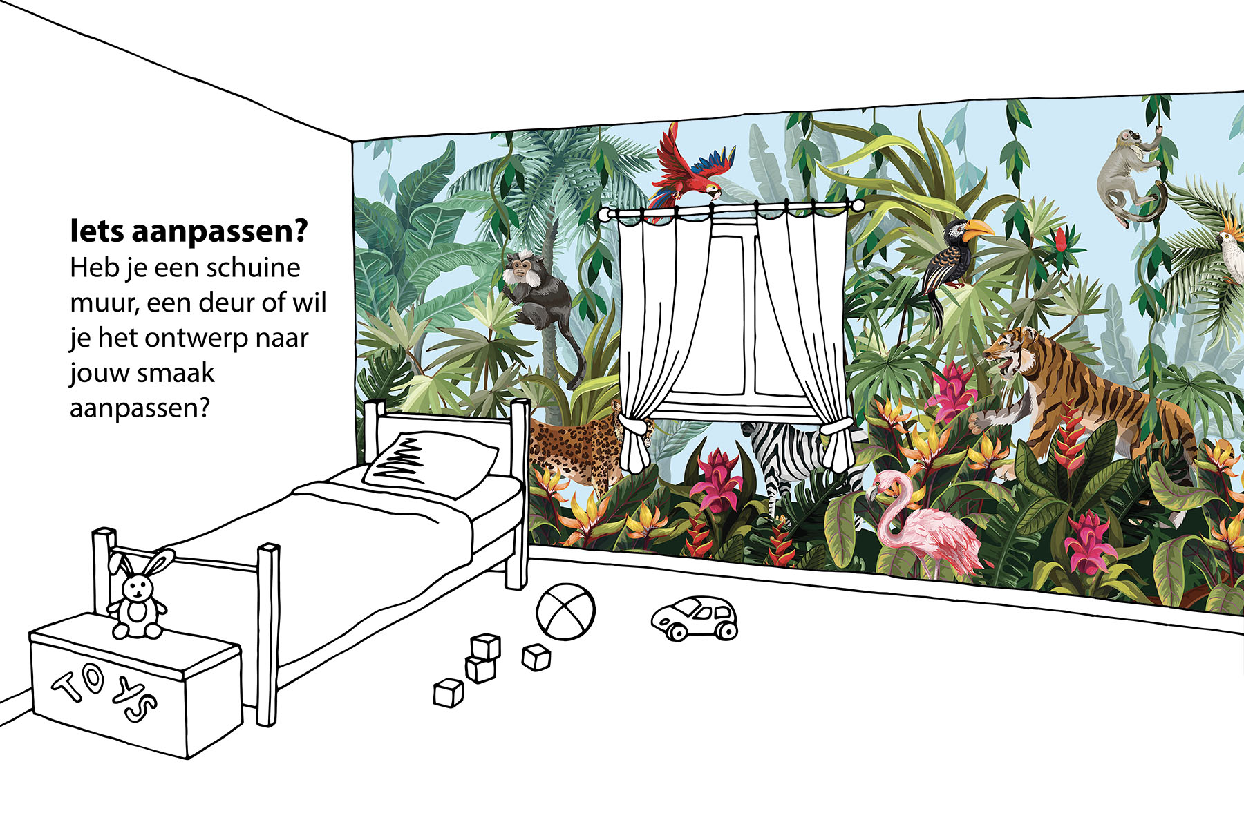 Rawrrr, met dit jungle behang ben je de koning van het oerwoud! Tussen de kleurrijke explosie van bladeren, lianen en bloemen zijn er ontzettend veel dieren te ontdekken; zie jij bijvoorbeeld de tijger, kakatoe en aapjes? We drukken deze toffe schildering op sterk, krasvast en waterproof behang, zodat je zoon of dochter er jarenlang plezier van heeft.[/vc_column_text][porto_block id="4285" name="contact-behang"][vc_empty_space height="20px"][/vc_column][vc_column width="1/2"][porto_block id="1002" name="technische-details-behang"][/vc_column][/vc_row][vc_row][vc_column width="1/2"][vc_column_text]