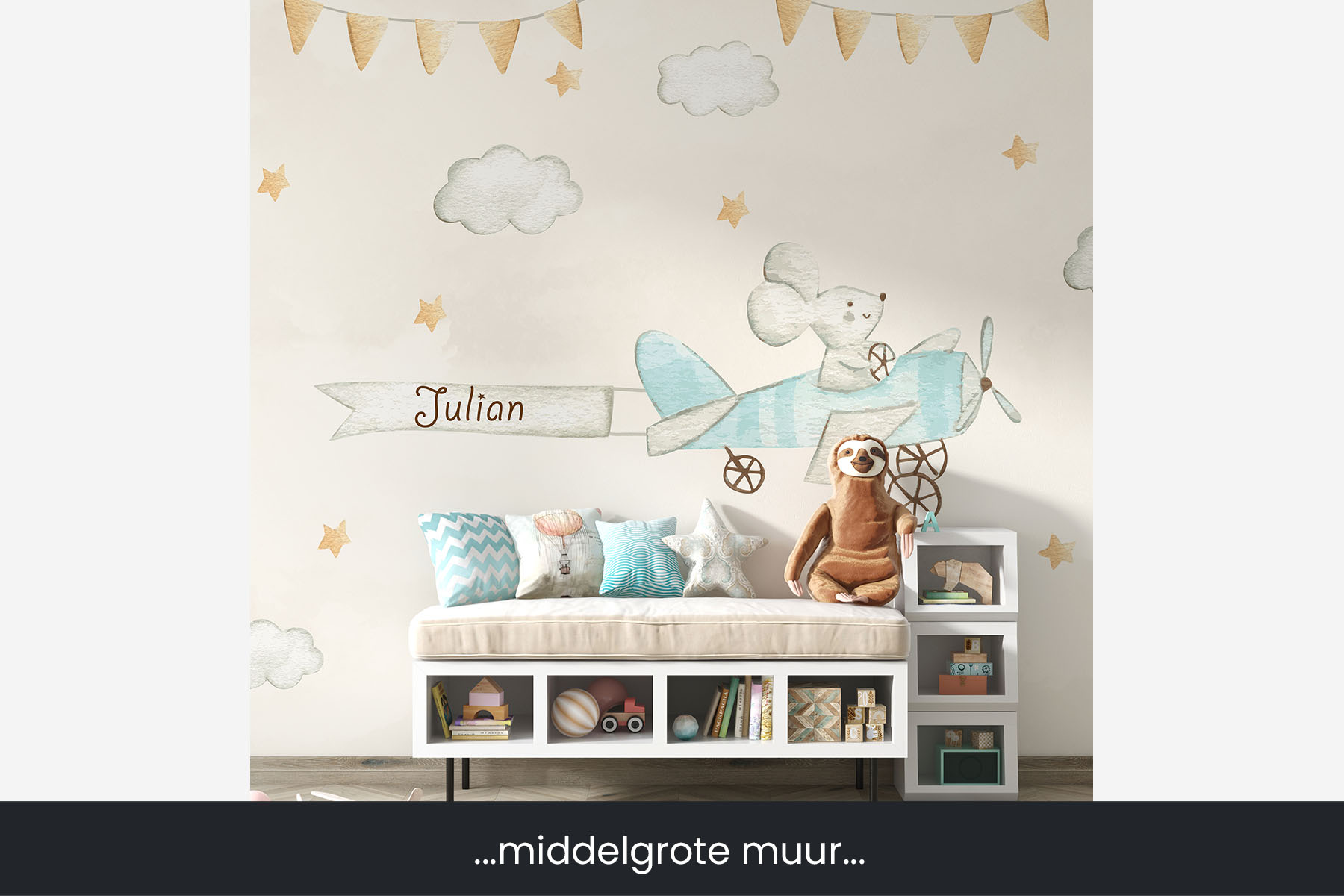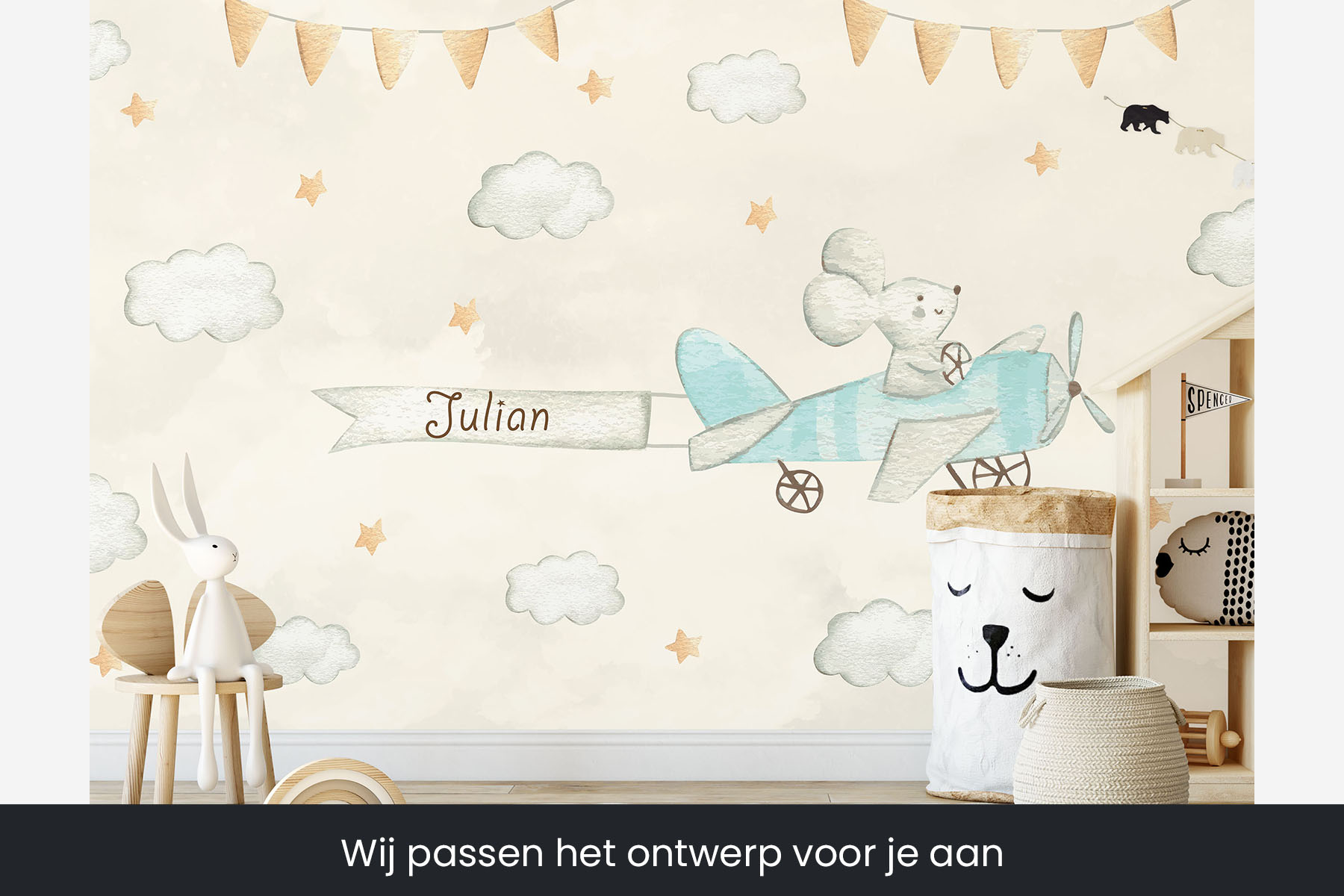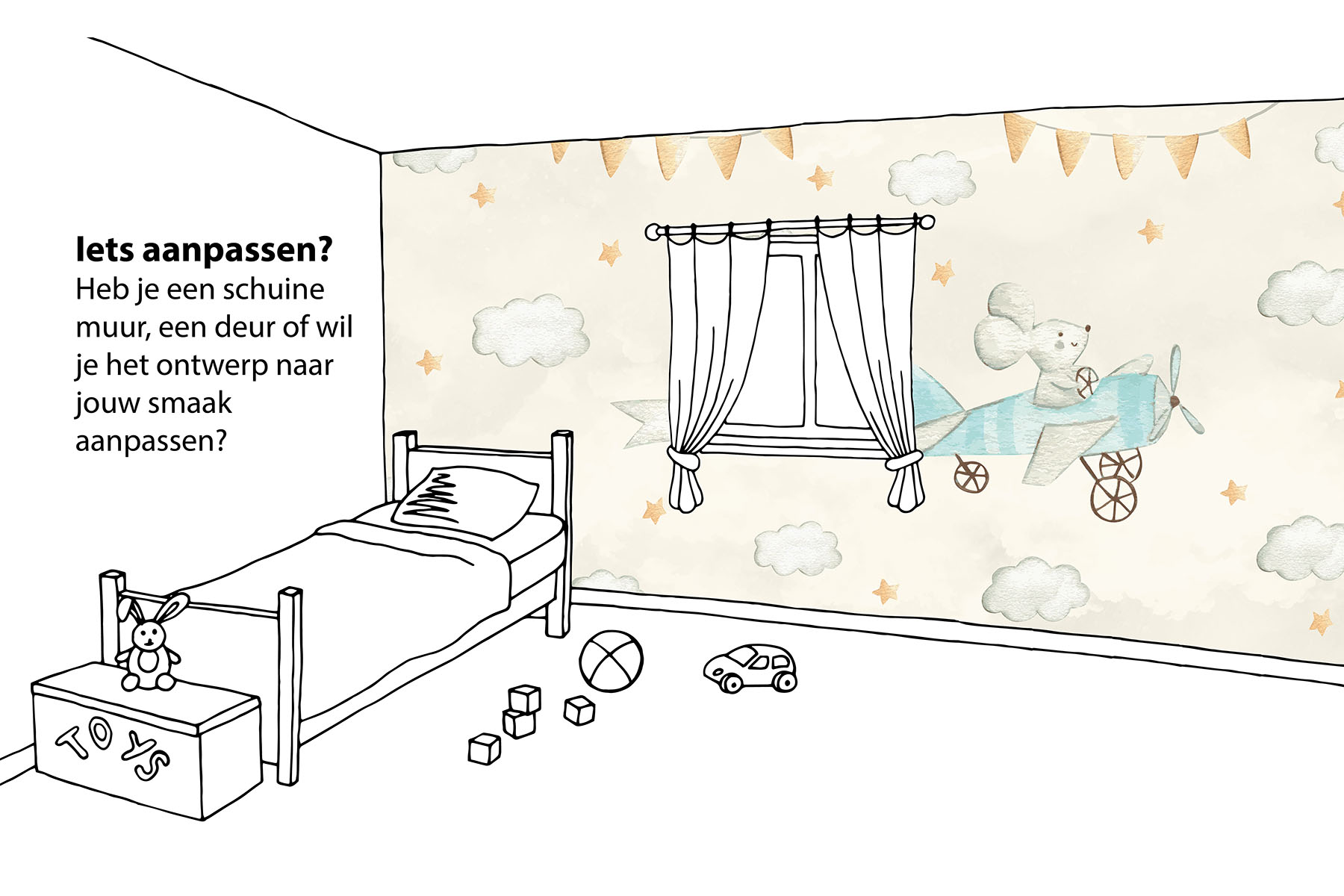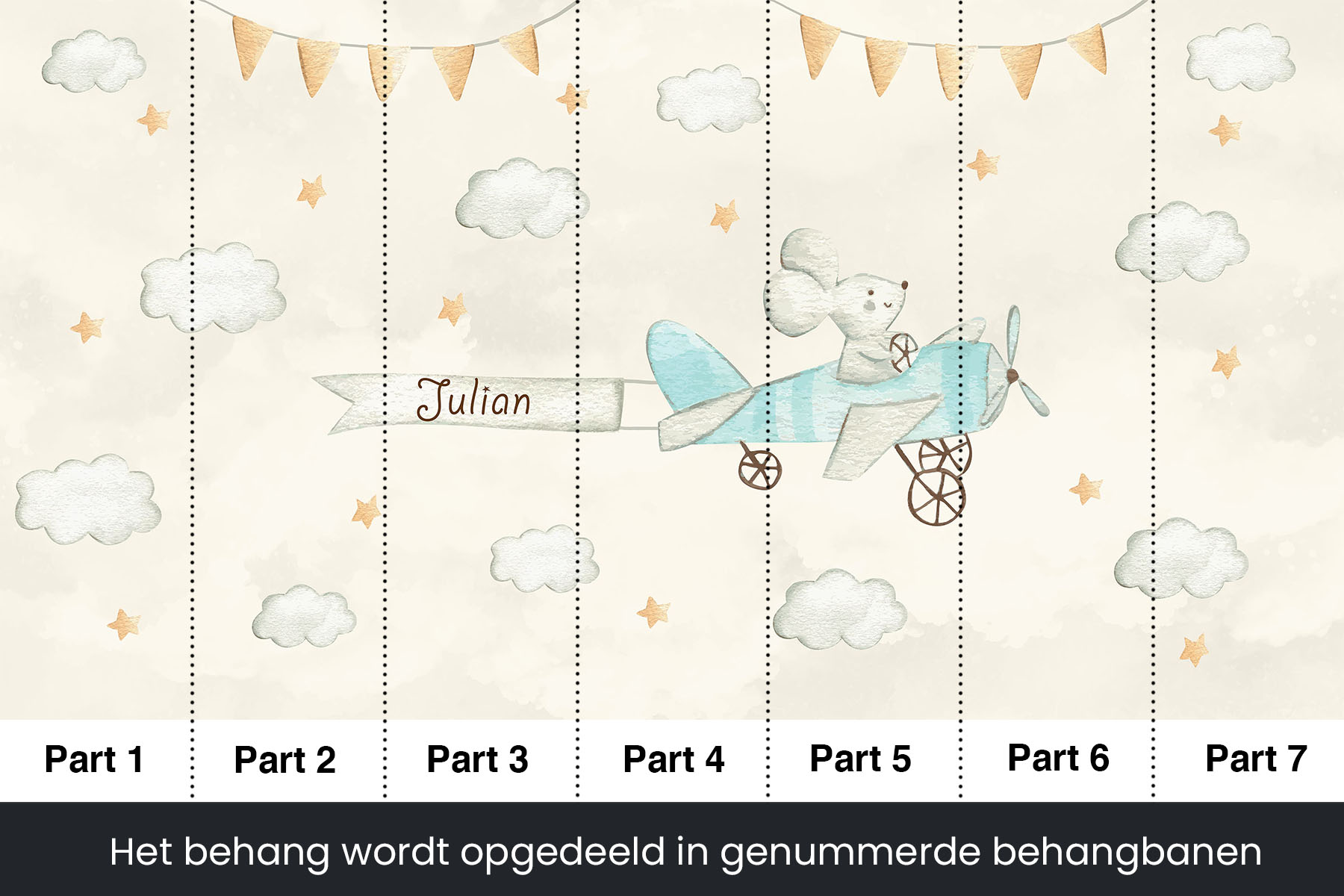 Piloot muis zweeft de kinderkamer door met de naam van jouw zoon of dochter achter hem aan. Geef bij het opmerkingenveld de naam van jouw zoon of dochter door en wij passen het behang aan. Uiteraard kunnen we ook de kleur van onder andere het vliegtuig aanpassen. We drukken deze prachtige schildering op sterk, krasvast en waterproof behang, zodat je dochter er jarenlang plezier van heeft.[/vc_column_text][porto_block id="4285" name="contact-behang"][vc_empty_space height="20px"][/vc_column][vc_column width="1/2"][porto_block id="1002" name="technische-details-behang"][/vc_column][/vc_row][vc_row][vc_column][vc_separator color="custom" border_width="2" style="solid" accent_color="#f4f4f4"][vc_empty_space height="5px"][/vc_column][/vc_row][vc_row][vc_column width="1/2"][vc_column_text]