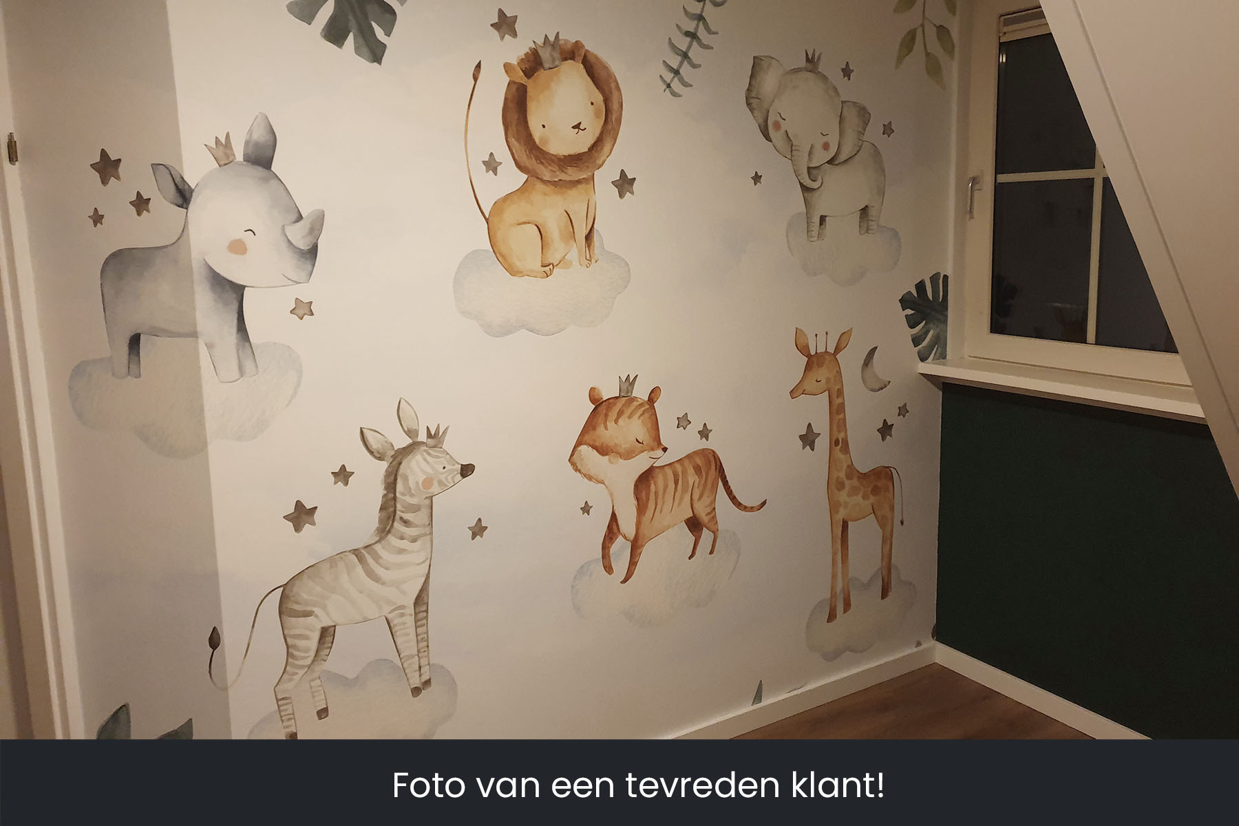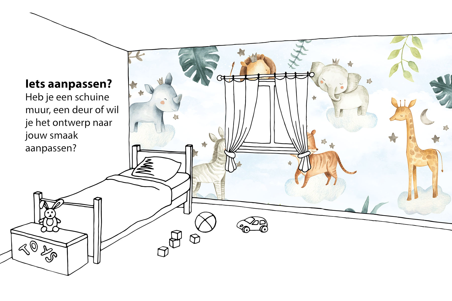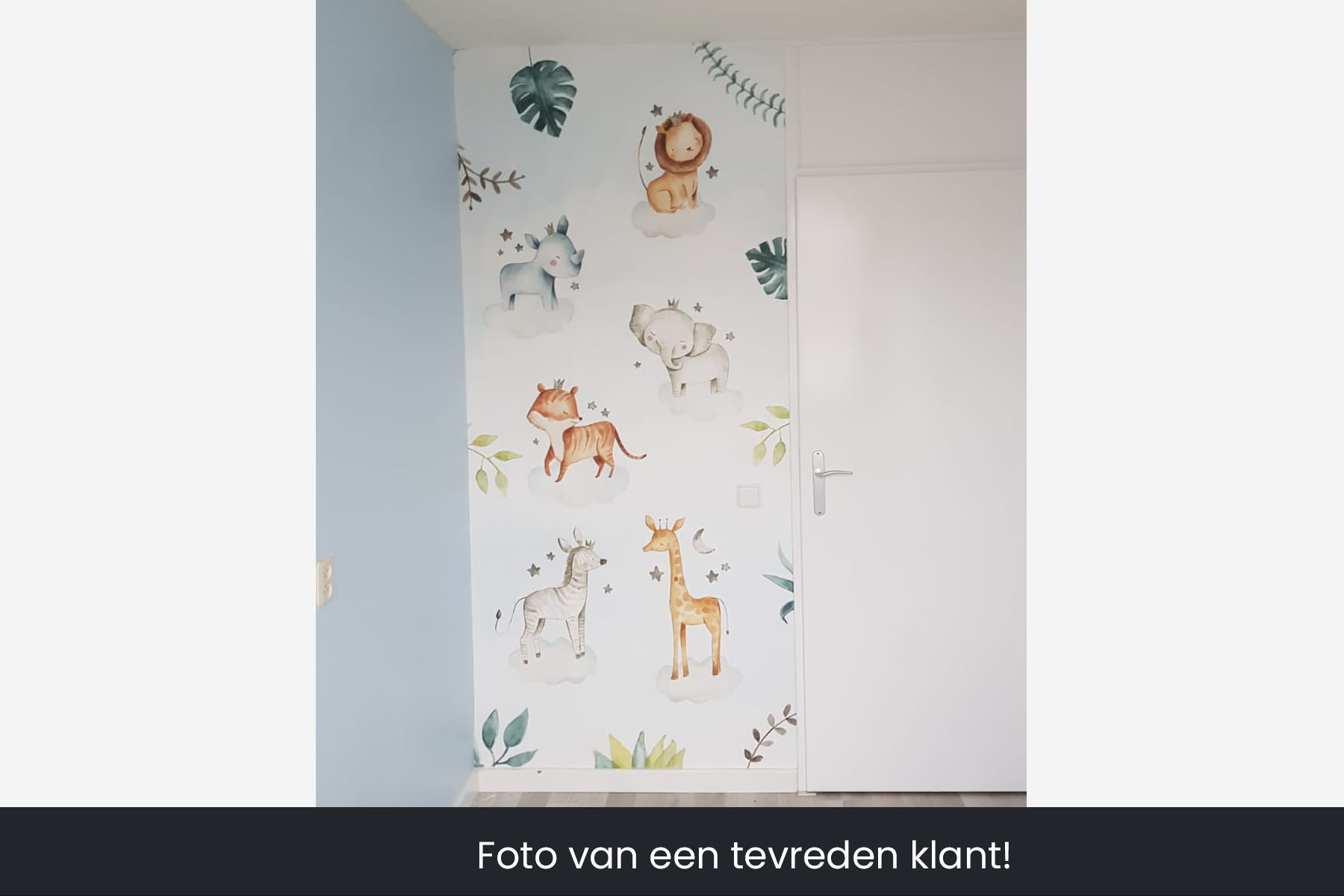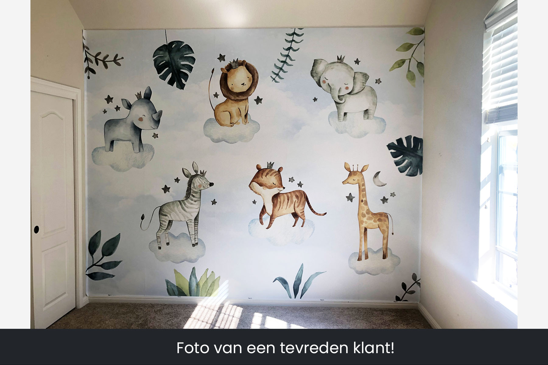 Ahh, wat zijn deze safari dieren lief! Ze zweven door de lucht op wolken. Het is een perfecte print voor een schattige babykamer. We drukken deze toffe schildering op sterk, krasvast en waterproof behang, zodat je zoon of dochter er jarenlang plezier van heeft.[/vc_column_text][porto_block id="4285" name="contact-behang"][vc_empty_space height="20px"][/vc_column][vc_column width="1/2"][porto_block id="1002" name="technische-details-behang"][/vc_column][/vc_row][vc_row][vc_column][vc_separator color="custom" border_width="2" style="solid" accent_color="#f4f4f4"][vc_empty_space height="5px"][/vc_column][/vc_row][vc_row][vc_column width="1/2"][vc_column_text]
