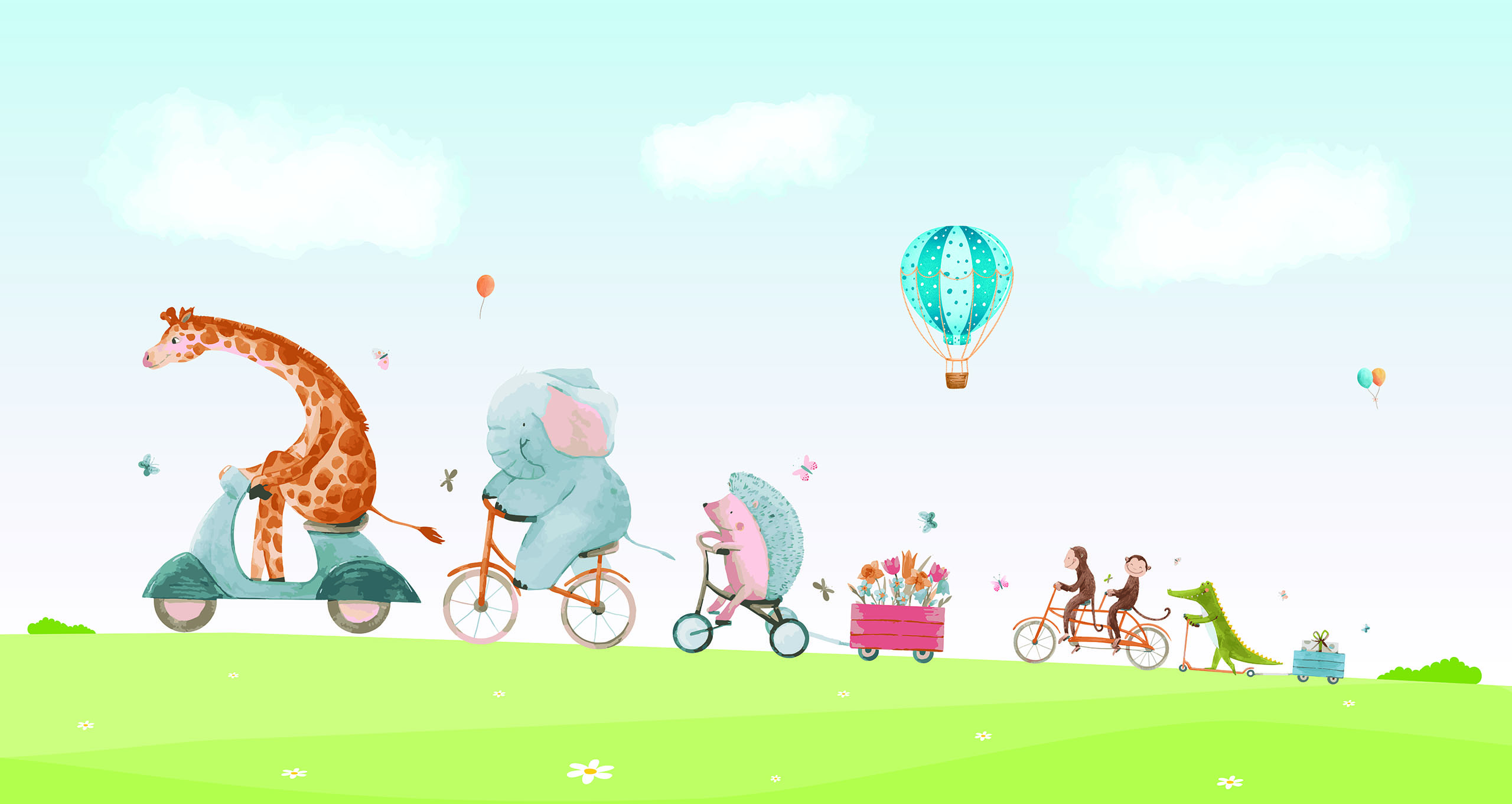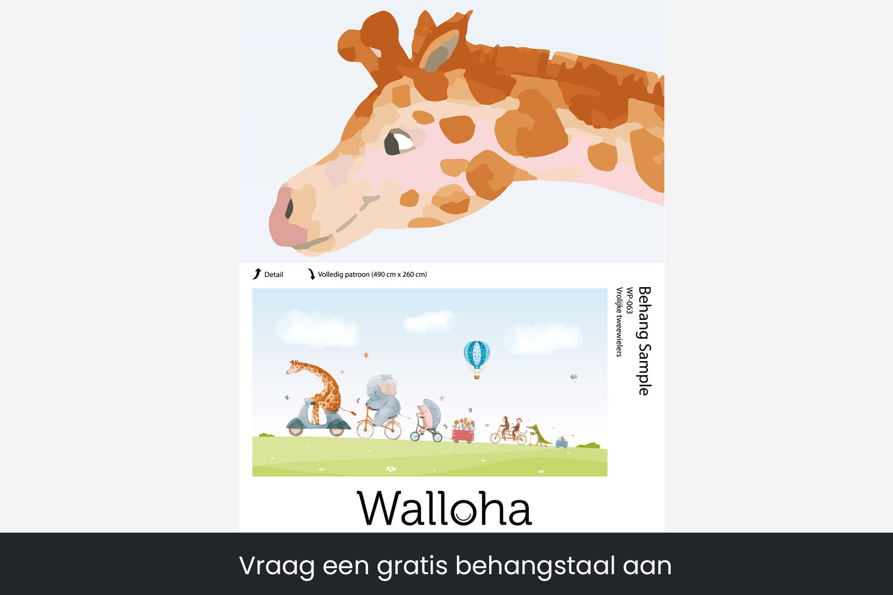 Ahh, wat zijn deze dieren lief en vrolijk! Het is een perfecte print voor een schattige babykamer. Deze vrolijke dierenvriendjes fietsen gezellig samen over het gras. Maar waar gaan ze naartoe? Onthoud dat we de hoogte van het gras kunnen aanpassen naar jouw wensen! We drukken deze toffe schildering op sterk, krasvast en waterproof behang, zodat je zoon of dochter er jarenlang plezier van heeft.[/vc_column_text][porto_block id="4285" name="contact-behang"][vc_empty_space height="20px"][/vc_column][vc_column width="1/2"][porto_block id="1002" name="technische-details-behang"][/vc_column][/vc_row][vc_row][vc_column width="1/2"][vc_column_text]
