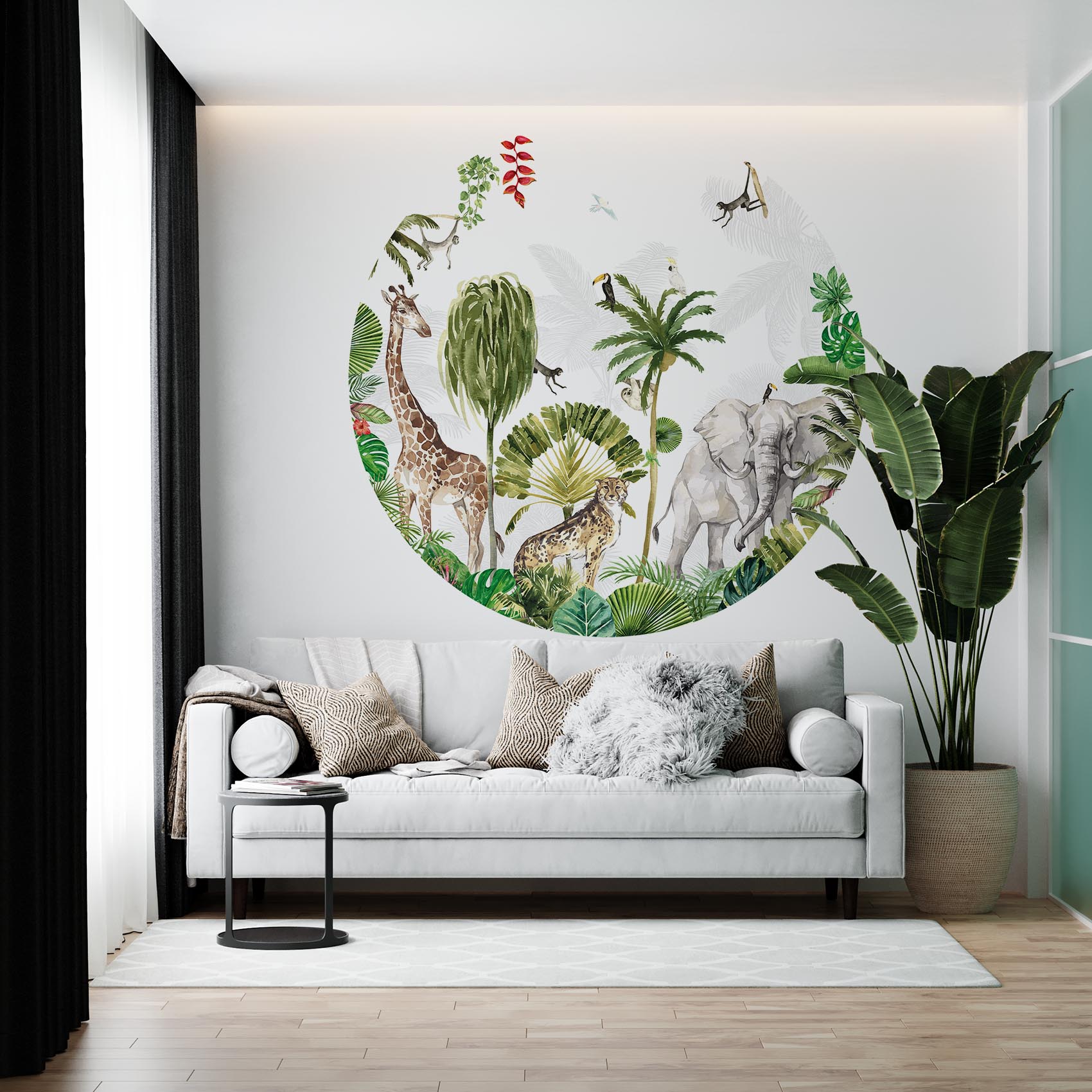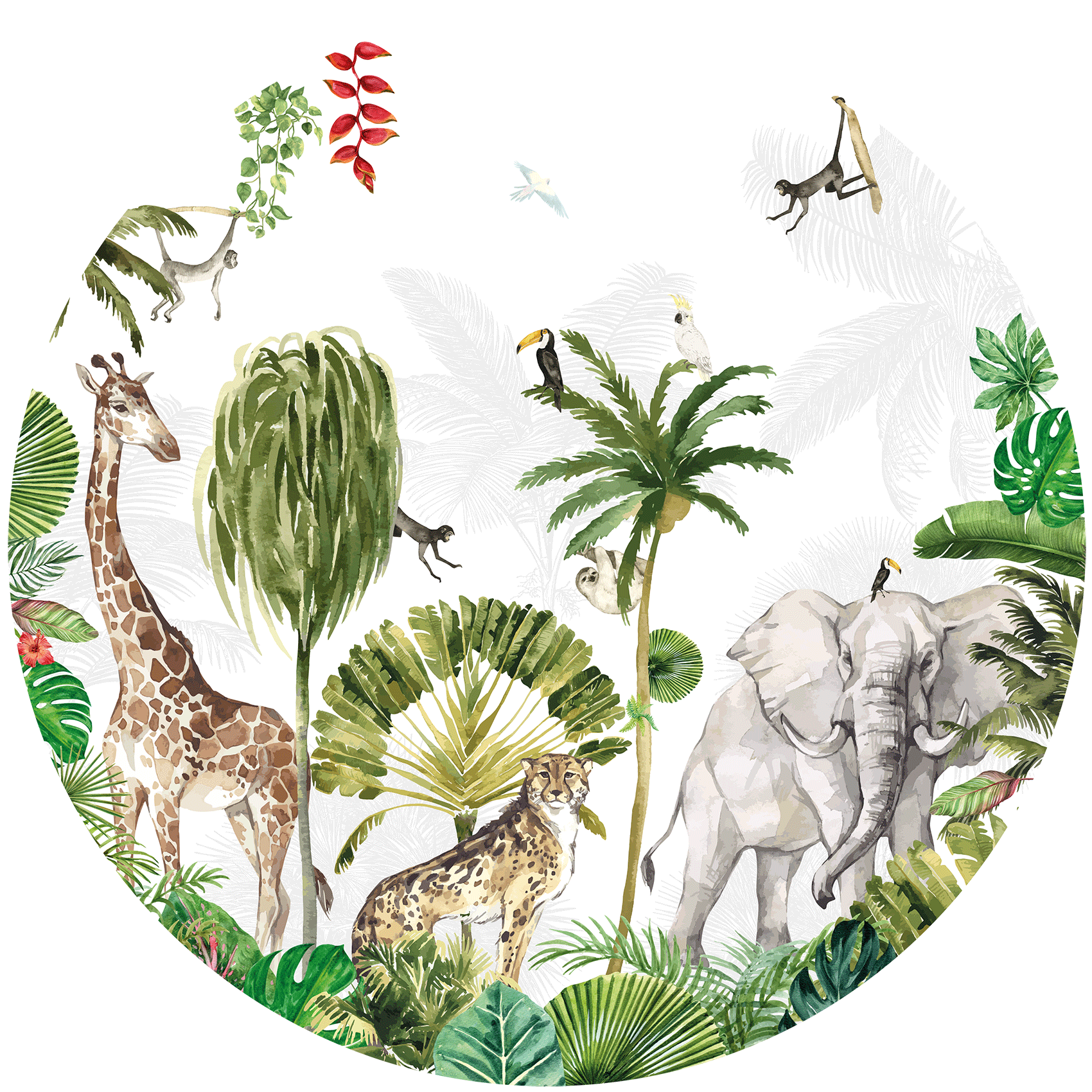 Ga op jungle avontuur in de kinderkamer van je zoon of dochter, want dit behang op de muur is super gaaf. Ontdek allerlei wilde dieren tussen het bladerdek. Geef de kinderkamer een instant sfeerboost met deze behangcirkel!