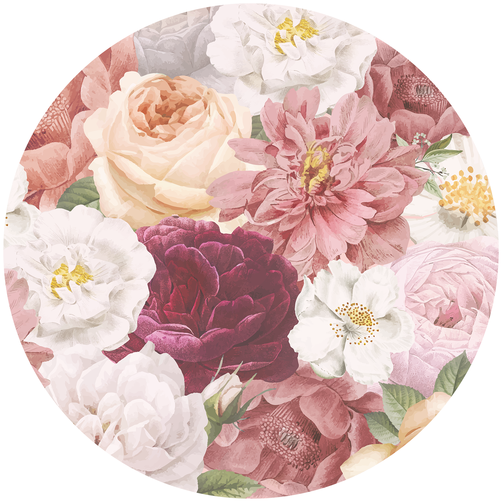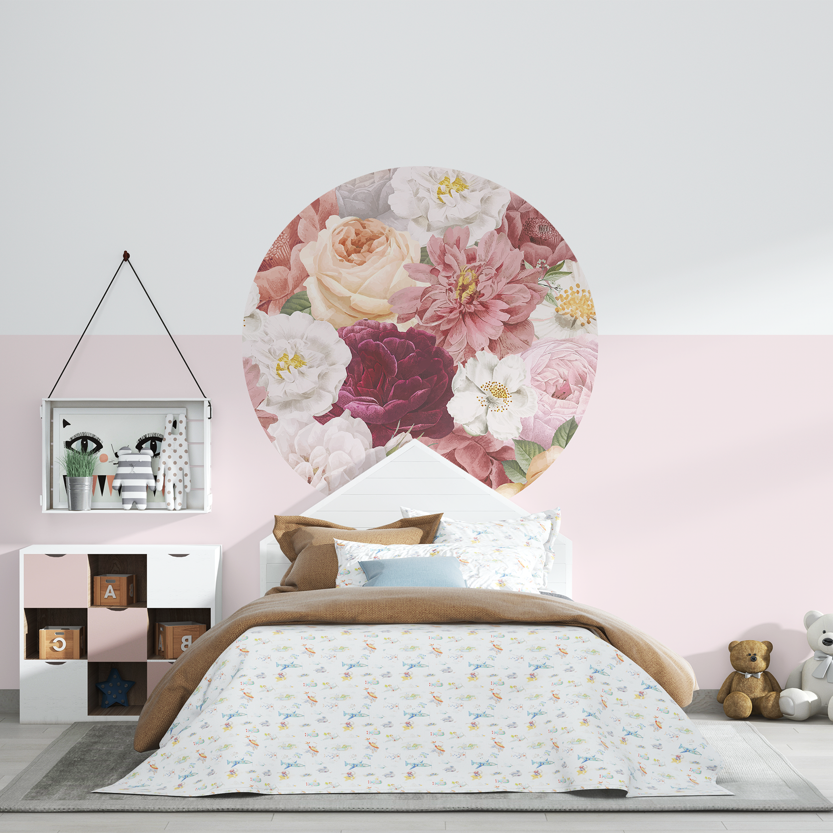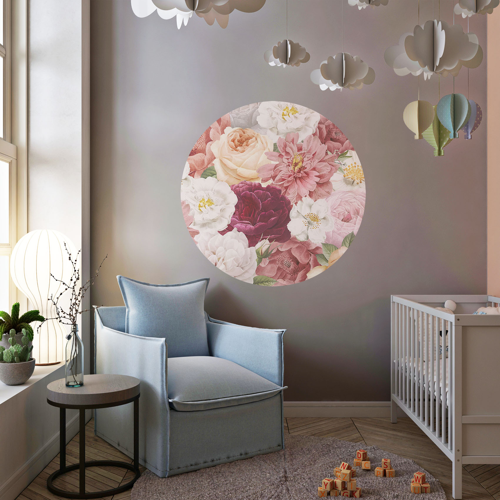 Met deze dromerige bloemen behangcirkel met verschillende soorten rozen geef je een klassieke, maar ook moderne uitstraling aan de meisjes- of tienerkamer van je dochter. Geef de kinderkamer een instant sfeerboost met deze behangcirkel!