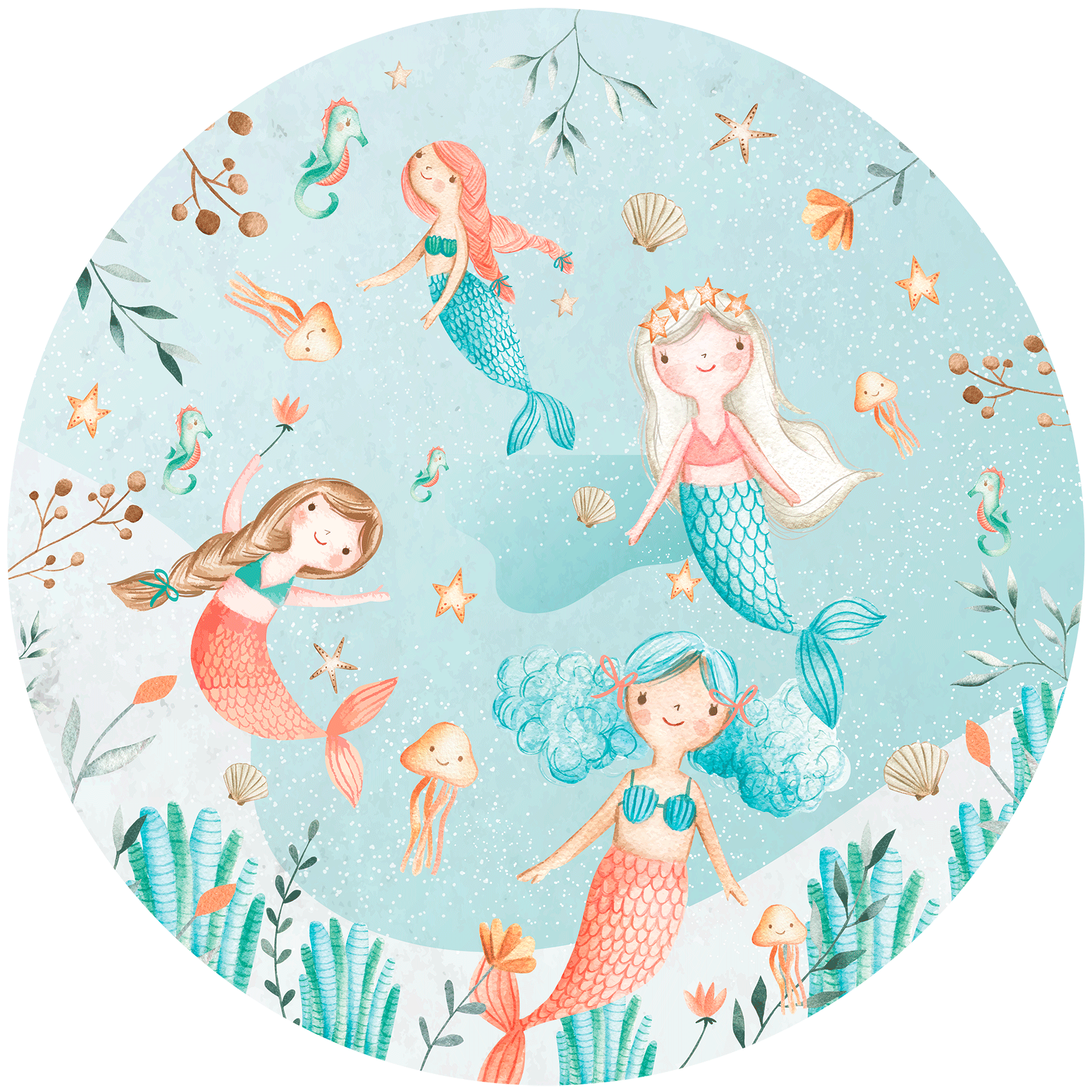 Ontdek de diepe zee samen met deze meermin meisjes! Deze schattige zeemeerminnen wonen in de oceaan, tussen het kleurrijke koraal, kwalletjes, schelpen en zeepaardjes. Geef de kinderkamer een instant sfeerboost met deze behangcirkel!