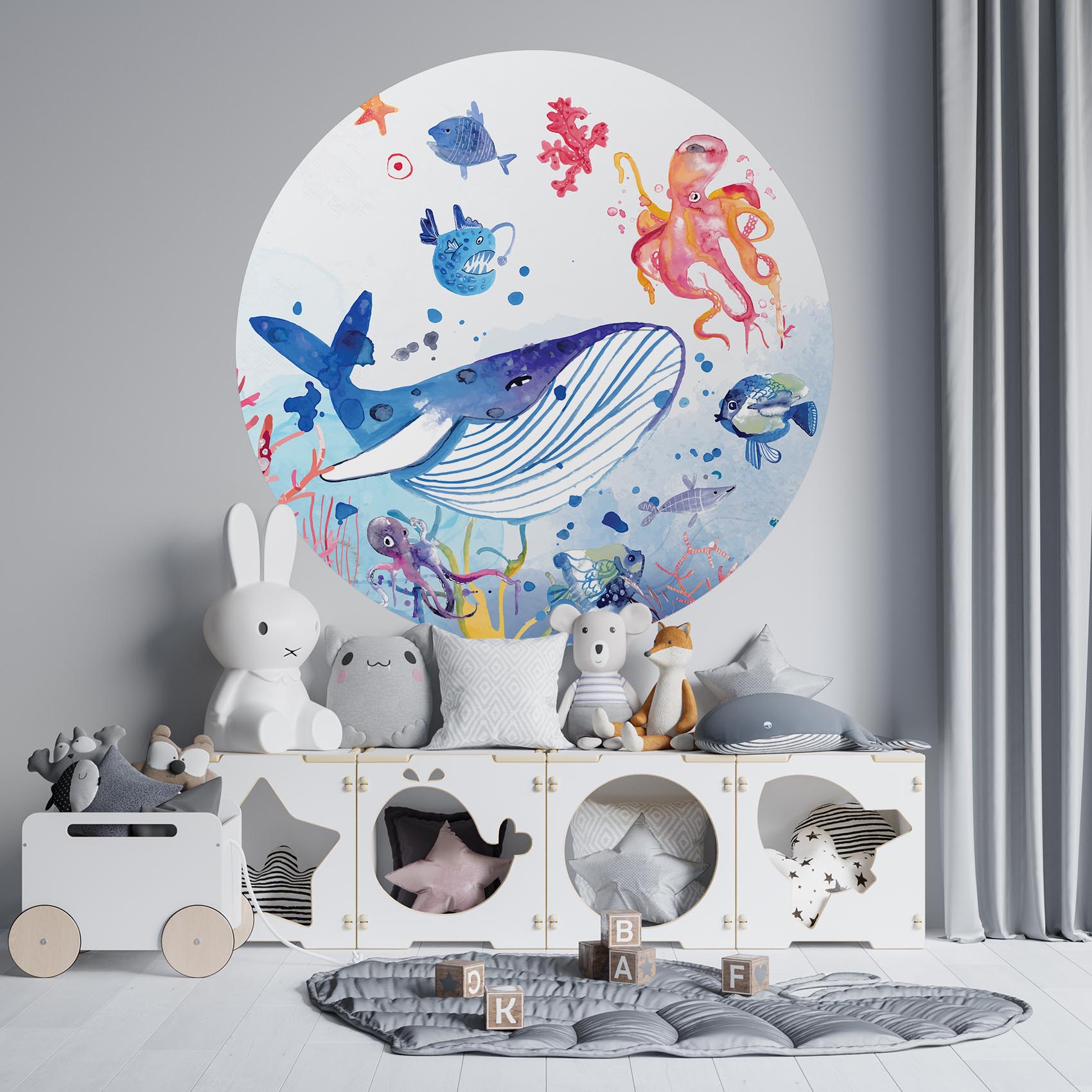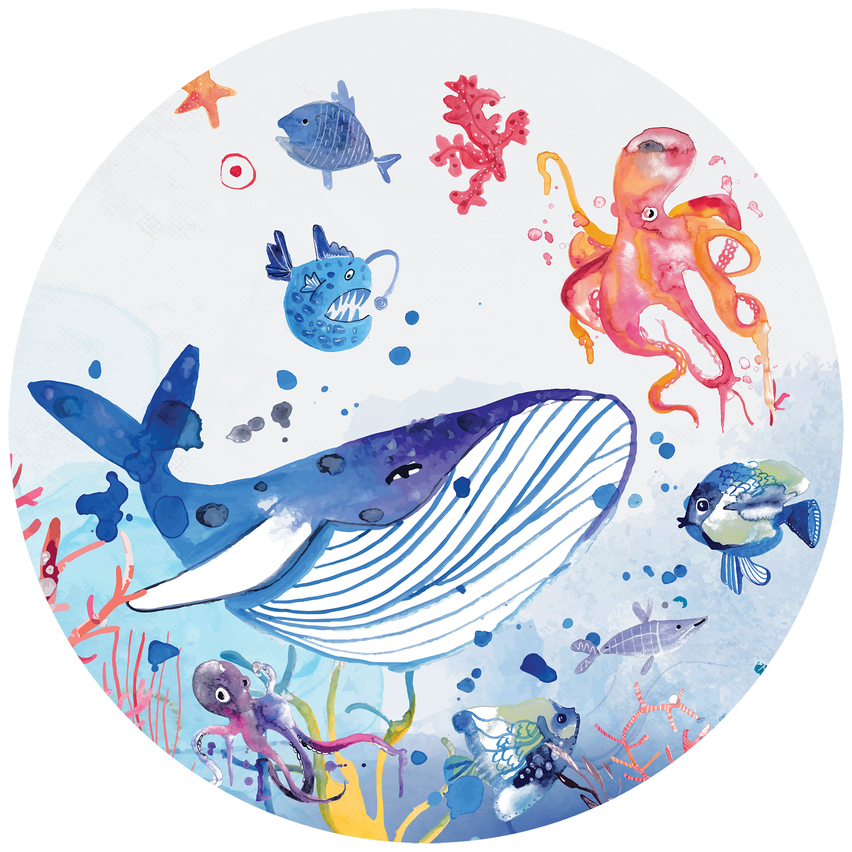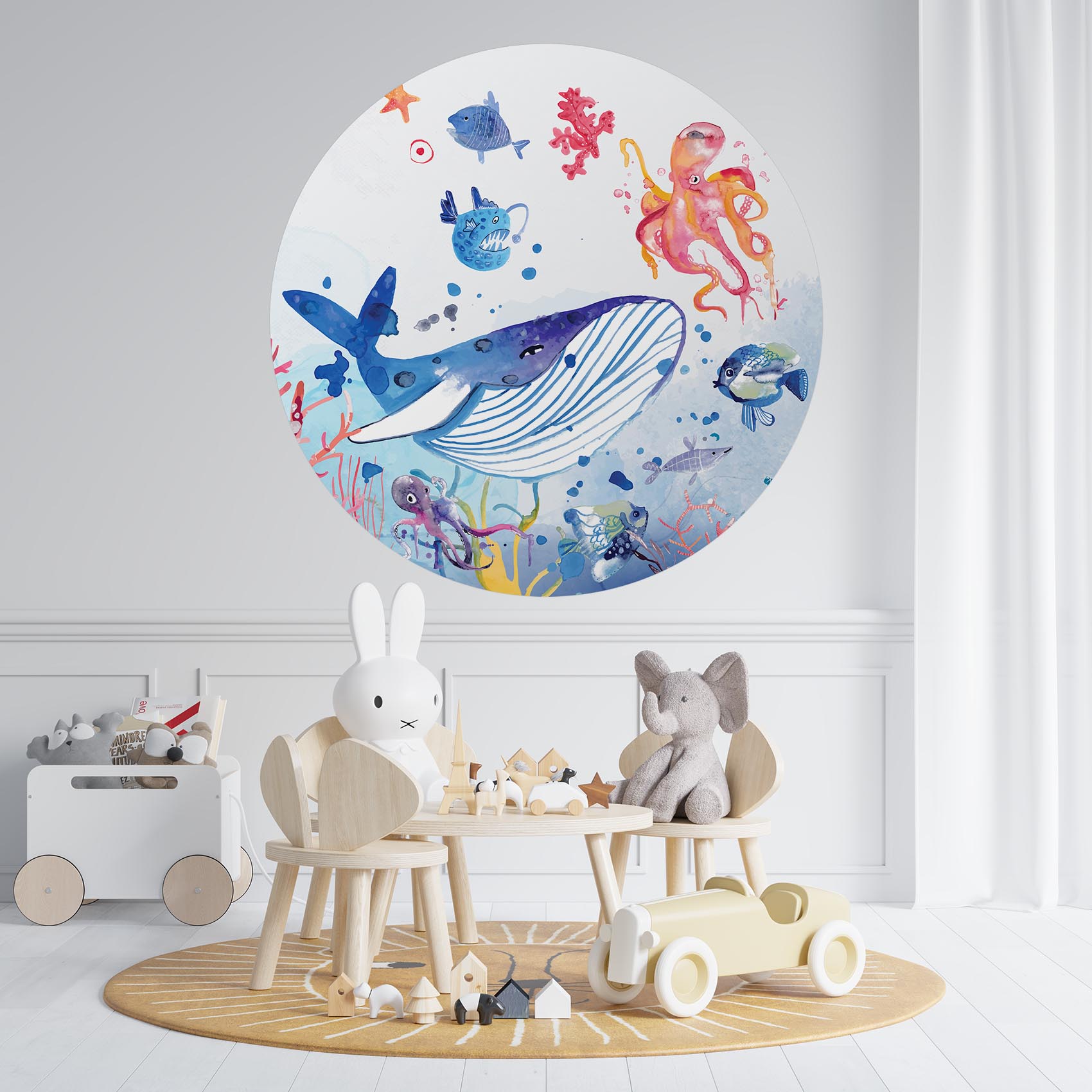 Zet je duikbril op, duik kopje onder en verwonder je over het leven in de diepe oceaan. Op deze kleurrijke oceaan behangcirkel raak je niet uitgekeken! Geef de kinderkamer een instant sfeerboost met deze behangcirkel!