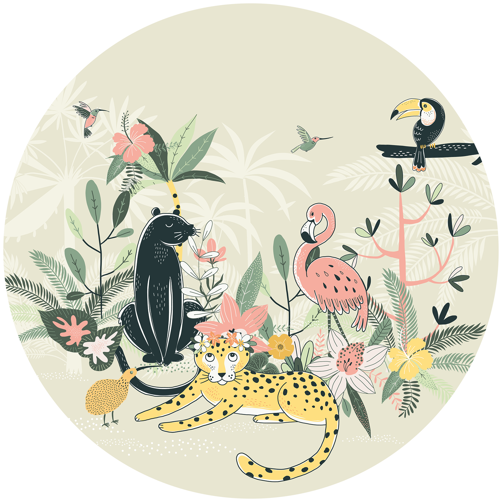 Oerwoud oase is een lieve behangcirkel met prachtige tekeningen van jungle dieren. Het zal zeker niet misstaan in een baby- of meidenkamer. Geef de kinderkamer een instant sfeerboost met deze behangcirkel!