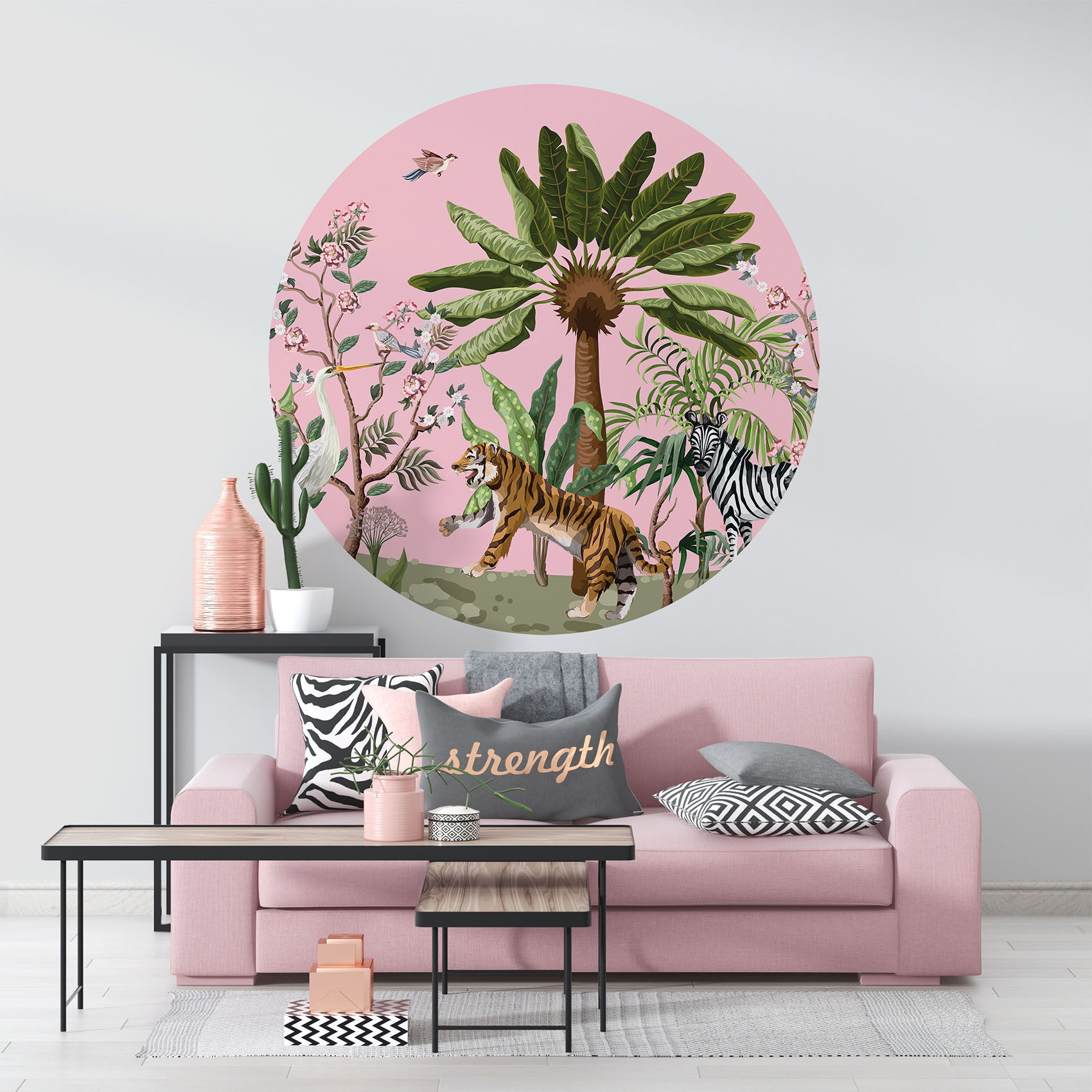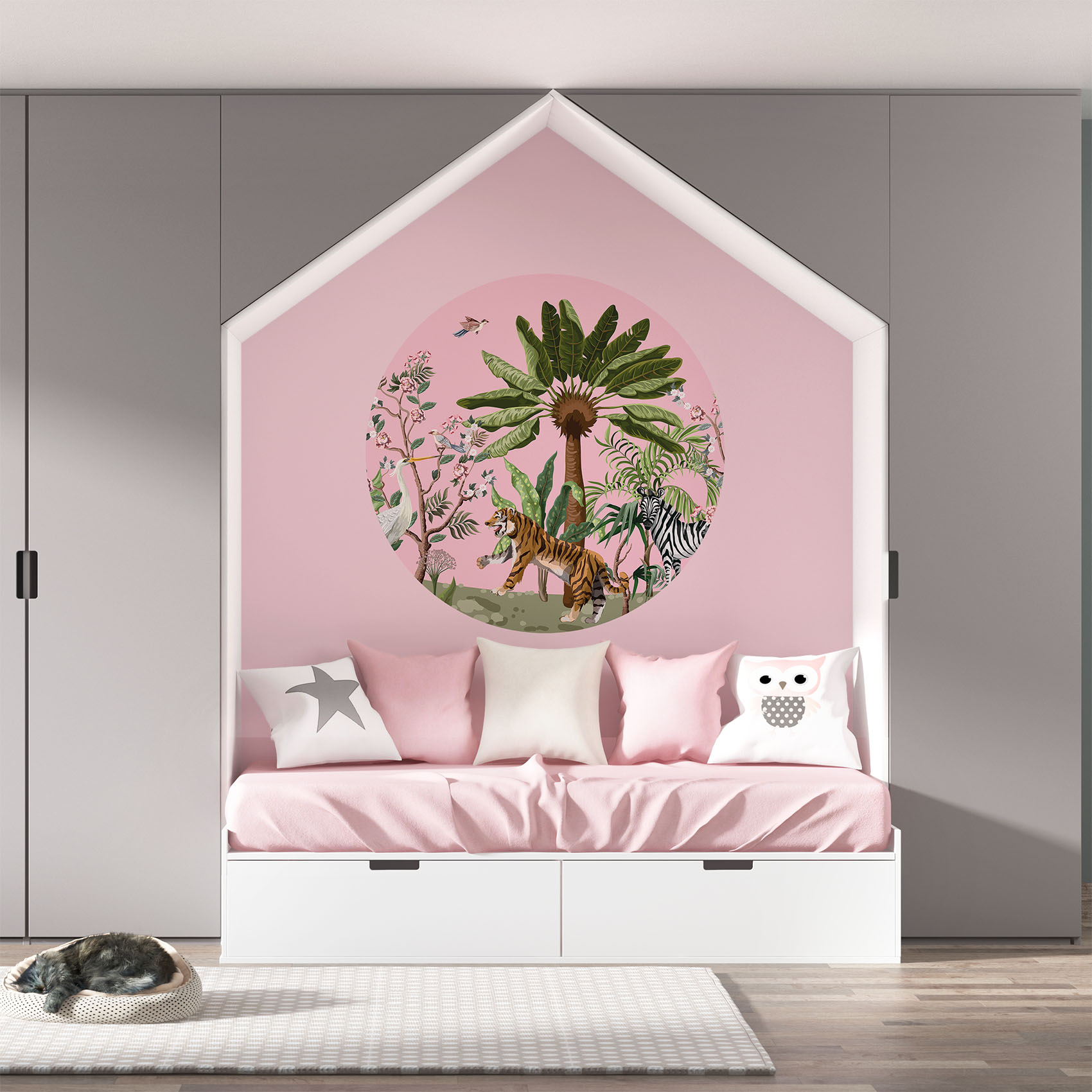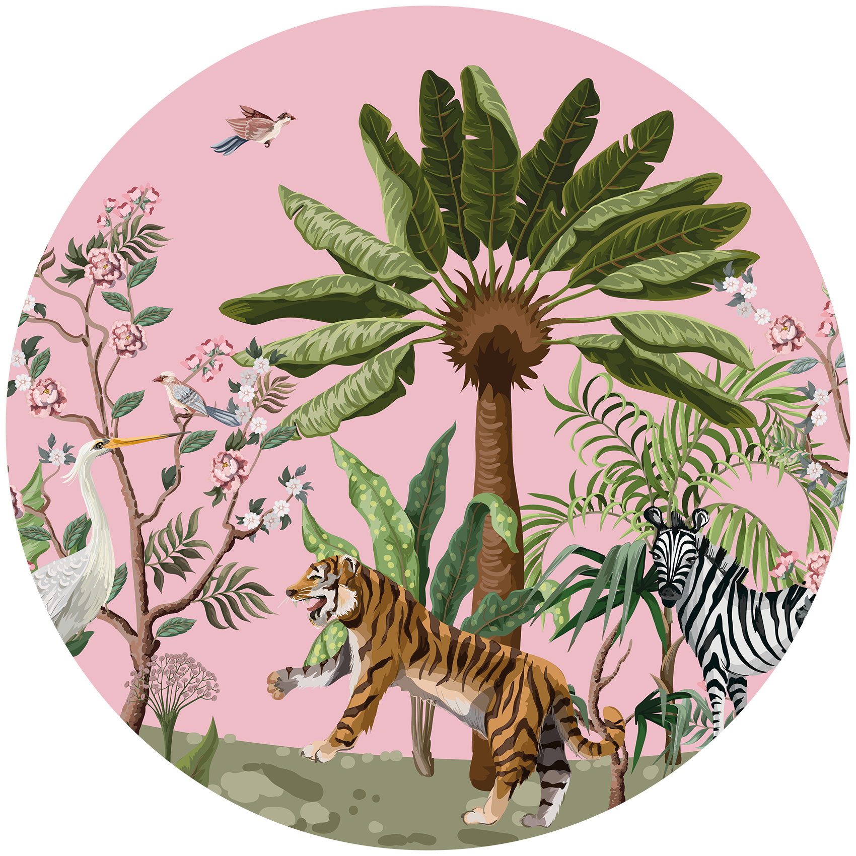 Versier je dochters kamer met deze schitterende jungle behangcirkel in Chinese stijl. De kleine vogeltjes, bomen en tijger geven het geheel een speelse, maar ook chique uitstraling. Geef de kinderkamer een instant sfeerboost met deze behangcirkel!